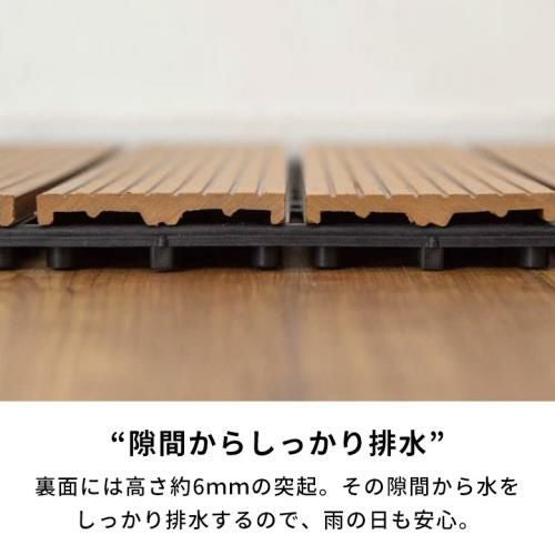 裏面には、高さ約6mmの突起。 そこから雨や水をしっかり逃がして、 溜まらない構造に。 屋根のないベランダや庭でも安心して使える、 衛生面にも配慮したウッドデッキです。