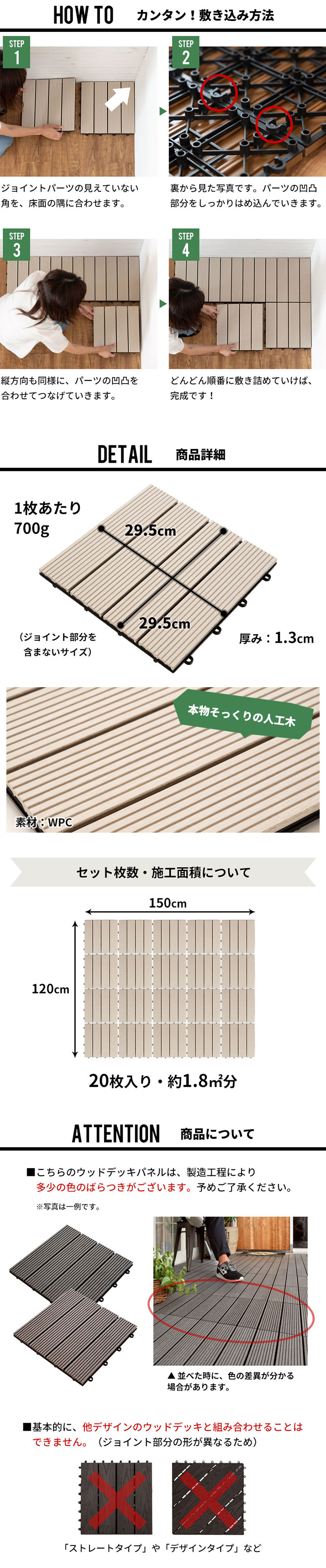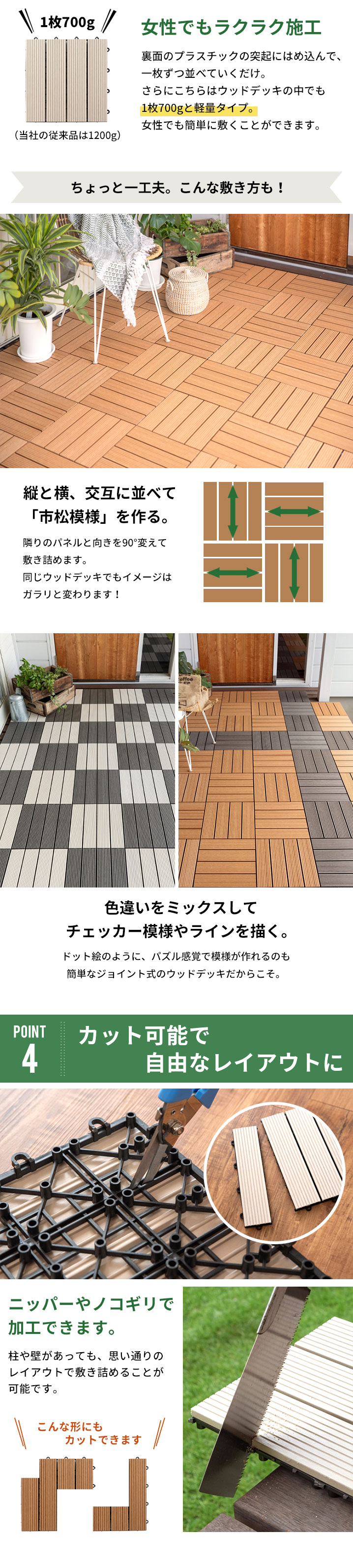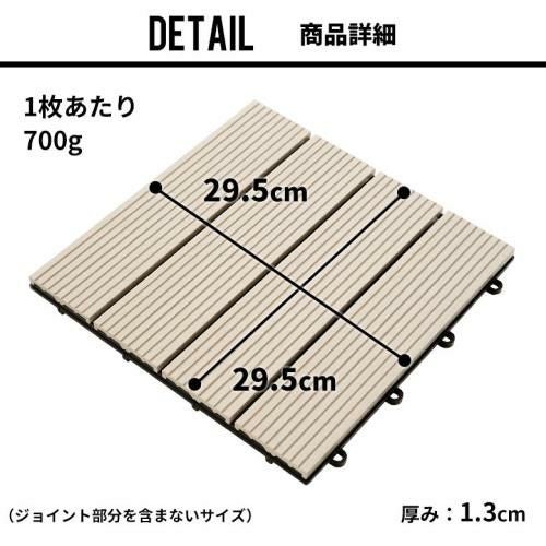 裏面のプラスチックの突起にはめ込んで、 一枚ずつ並べていくだけ。 さらにこちらはウッドデッキの中でも 1枚700gと軽量タイプ。 女性でも簡単に敷くことができます。