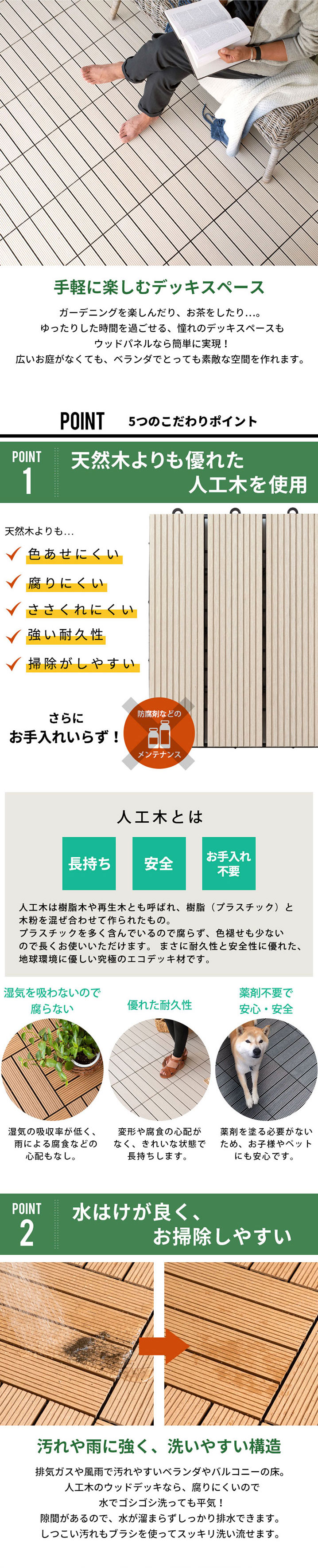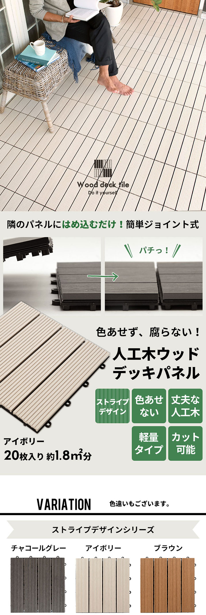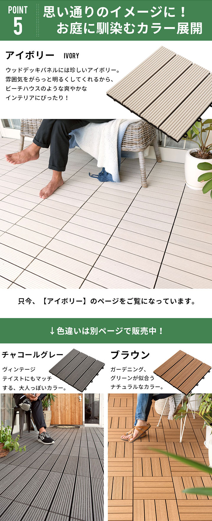 ウッドデッキパネルには珍しいアイボリー。 雰囲気をがらっと明るくしてくれるから、 ビーチハウスのような爽やかな インテリアにぴったり!