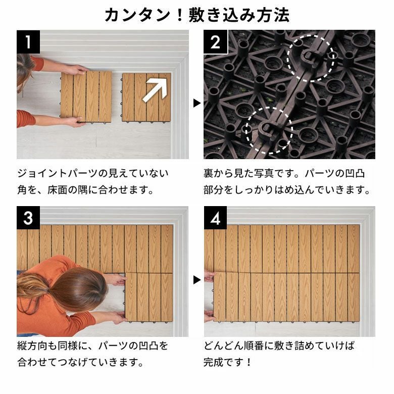 隣のパネルにはめ込むだけの簡単ジョイント式。 軽量タイプで1枚1枚が軽いので、女性でもラクラク施工できます。