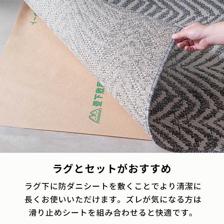ホコリを吸着しやすく、湿気もこもりがちなラグには、防ダニシートの併用がおすすめ。