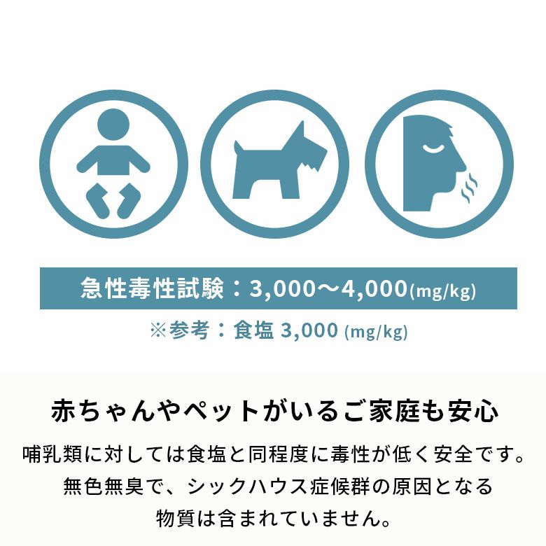哺乳類に対する毒性は低く、ほぼ食塩と同程度です。