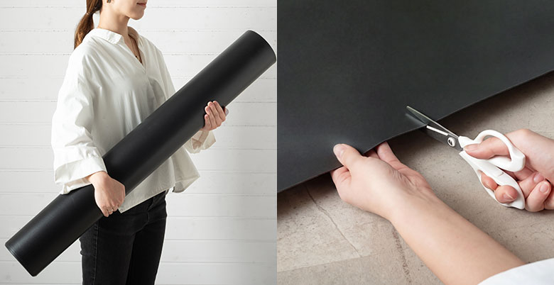 1.5mmの薄型設計で、上にフロアタイルを敷いても厚みが出にくくキレイな仕上がり。約1.2kgと軽量で一人での施工でも安心。1ロールで約6畳分。6畳以下に使用する場合は、ハサミやカッターでカット可能なので、トイレや洗面所などの狭い場所にも対応できます。