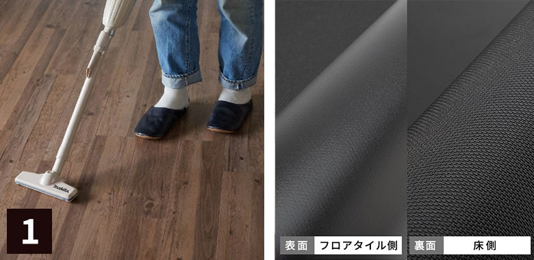 シートの凹凸のない面が上(フロアタイル側)、凹凸のある面を下 (床側) にします。