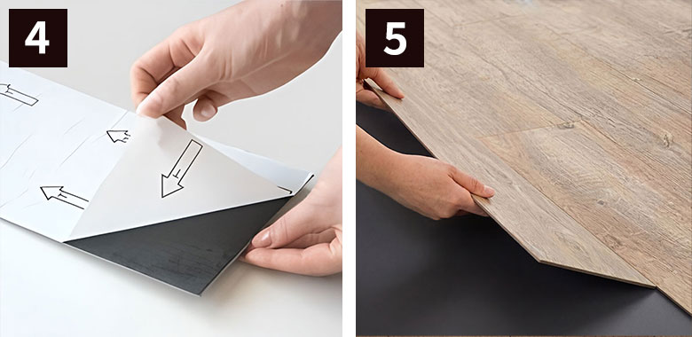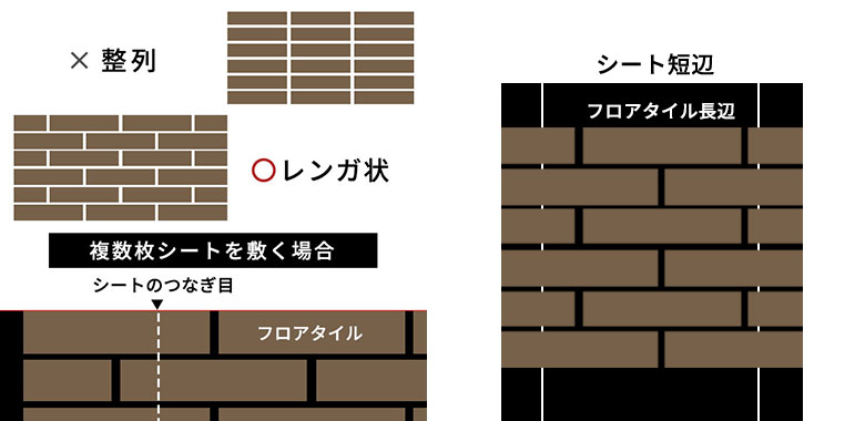 フロアタイルはレンガのように敷くのがポイント。※複数枚原状回復シートを使用する場合はシートのつなぎ目を横切るように敷きます。