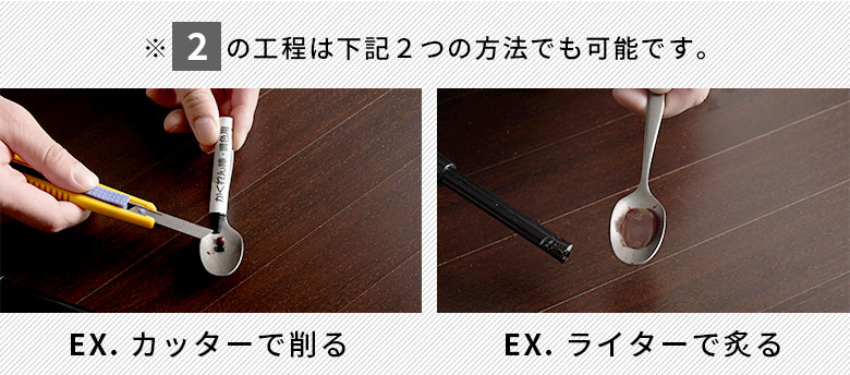 ヘラで木目に沿って削ります。複数色を混ぜる場合は②③を繰り返します。