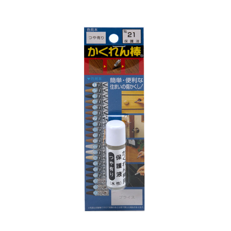 フローリングや木製家具に合わせやすい基本カラーのかくれん棒4本と、補修後に馴染ませる際に便利なヘラがセットに。4色を混ぜて調色してもご使用いただけます。全20色の豊富なカラーから選べる単品販売もご用意しています。