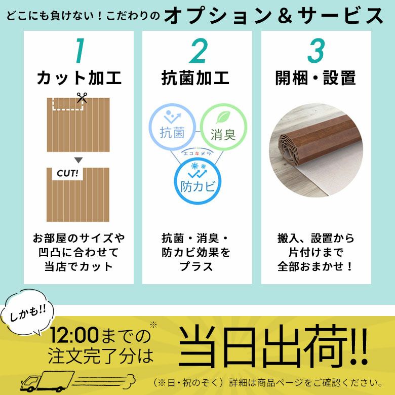 ●オーダーカットでお選びいただいたウッドカーペットをご希望のサイズに別注カットすることもできますので、ウッドカーペットを敷きたいお部屋が規格に合わないサイズだったり、柱や動かせない家具がある変則的なお部屋の場合もご安心ください。