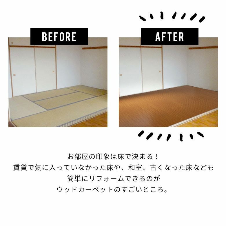 お部屋の印象は床で決まる! 賃貸で気に入っていなかった床や、和室、古くなった床なども 簡単にリフォームできるのがウッドカーペットのすごいところ。
