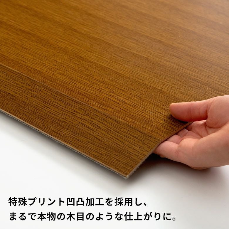 見た目も、触り心地も、本物のフローリングそっくり。ビニール製のやわらかい木目調フロアのような安っぽさは無く、まるで天然木のような凹凸を再現。温かみあるウッディな表情は、お部屋の印象を一気に変えてくれます。