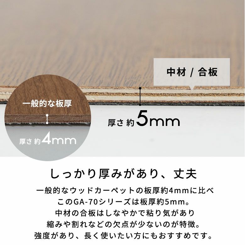 一般的なウッドカーペットの板厚 約4mmに比べ、このGA-70シリーズは板厚 約5mm。