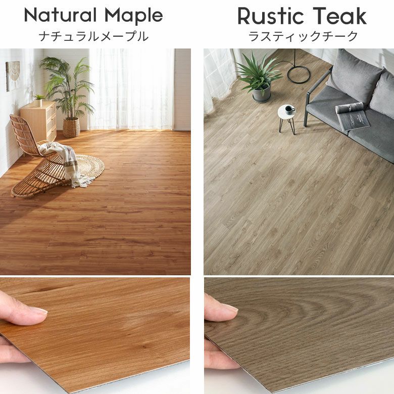 シール式フロアタイル。 貼るだけ、カンタン。シール式フロアタイル ナチュラルメイプルのフロアタイル 凹凸加工でリアルな質感。 ラスティックチークのフロアタイル スタンダードカラー6色。