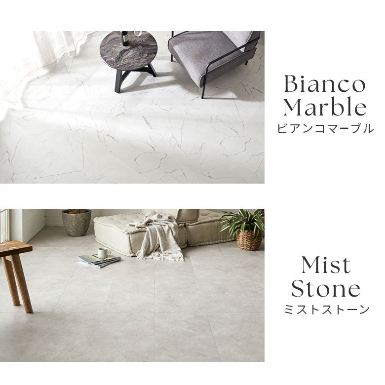 ・石の凹凸をリアルに再現したエンボス加工で、まるで大理石のような 仕上がり。素材の陰影まで感じられる上質な質感です。 ・空間をスタイリッシュに彩るカラー展開。お部屋の雰囲気や家具に合わ せて選べる多彩な表情で、理想のコーディネートを叶えます。 ・表面はキズや汚れに強く、水拭きでお手入れも簡単。撥水加工で水をこぼしてもサッと拭くだけ。ワイパーや雑巾がけでお掃除も簡単です。 ・丈夫で土足OK。店舗やオフィスにも安心して使用できます。 ・貼るだけでお部屋の印象を一新できる、手軽で頼れるフロアタイル ・「置くだけ」「シール」「ドライバック」の3タイプから用途に合わせて 選択可能。 ・貼ってはがせるタイプは賃貸でも安心。繰り返し使えるので、引っ越し先でも再利用できます。 ・薄くて軽いタイプなので価格もお手頃!加工もカッター1本で簡単にできるDIY初心者でも安心の仕様!女性でもラクに施工OK。