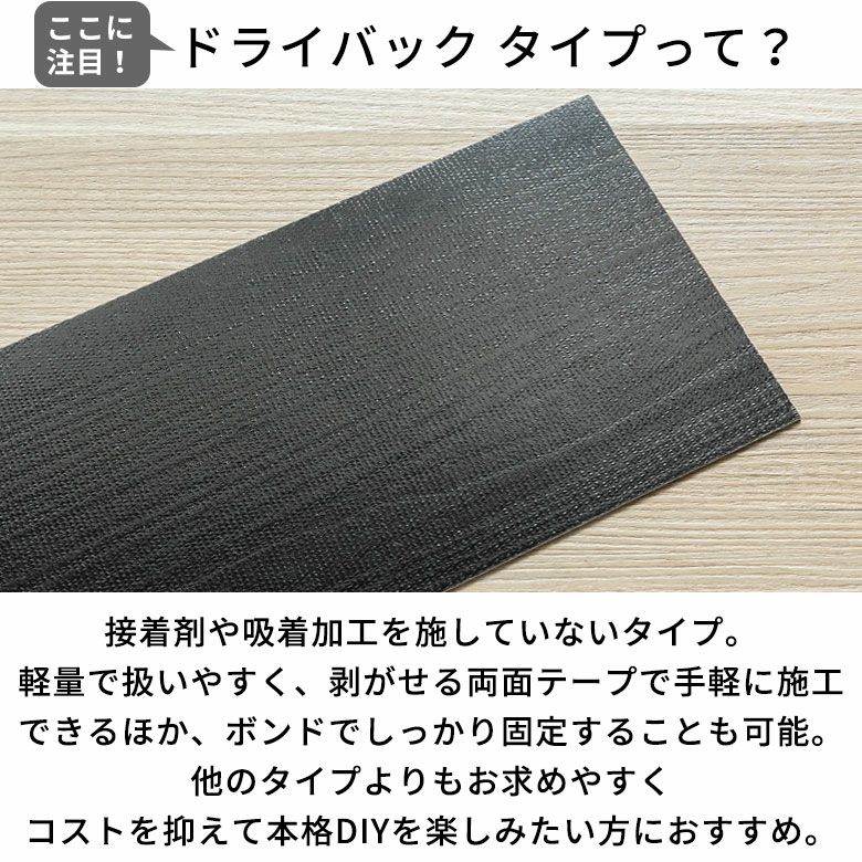 裏面は、接着剤や吸着加工のない「ドライバック」仕様。軽くて 扱いやすく、両面テープでもボンドでも施工OK!コスパ抜群で 本格DIYにぴったりのフロアタイルです。耐久性が高いので店舗や オフィスにもおすすめ。