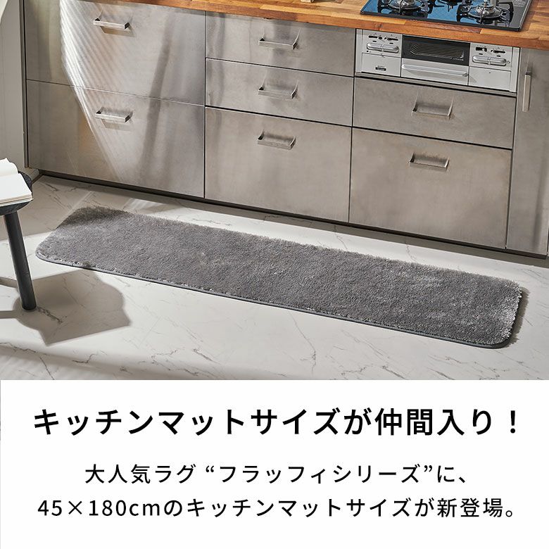 毛足18mmの超極細マイクロファイバーが生み出す柔らかな感触が特徴のフラッフィシリーズに、45×180cmのキッチンマットが仲間入り。