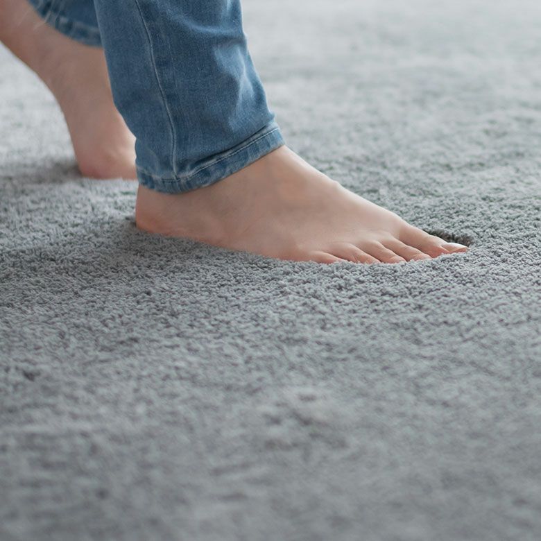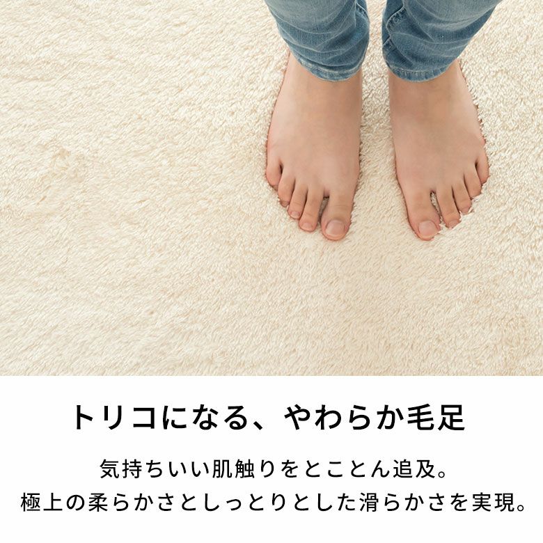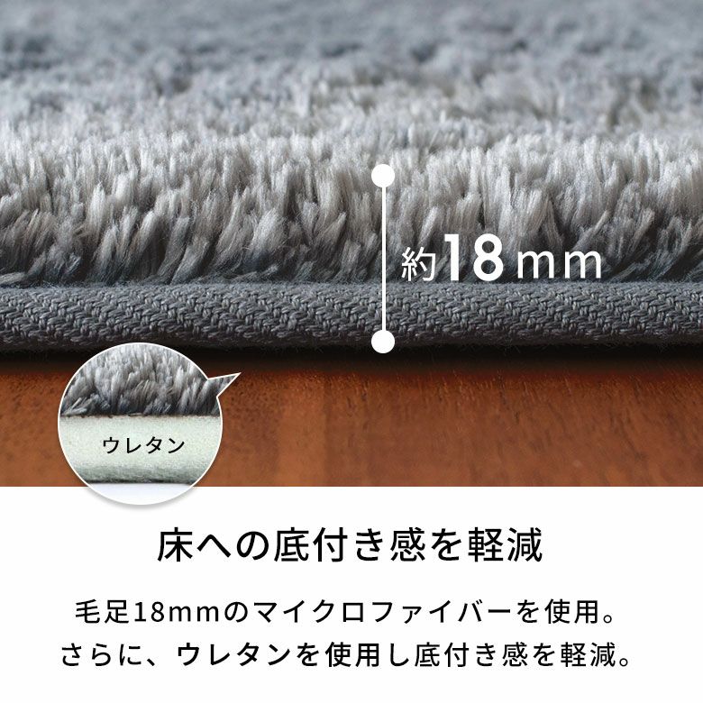 気持ちいい肌触りを追求し毛足18mmの極細マイクロファイバーを使用。柔らかく滑らかな触感で足元を優しく包み込む心地よさ。さらにウレタンを使用しているので床への底付きも軽減。