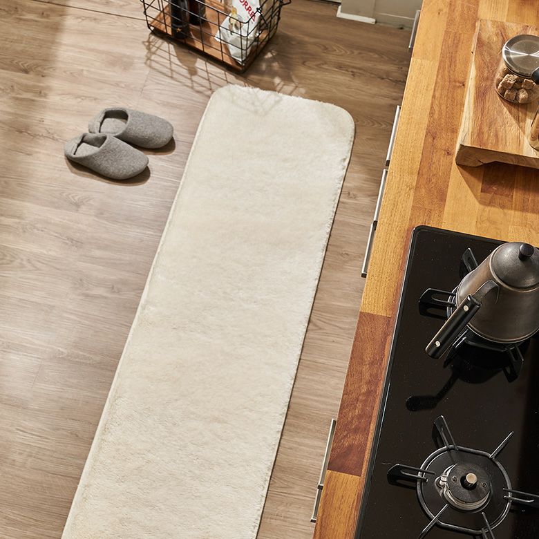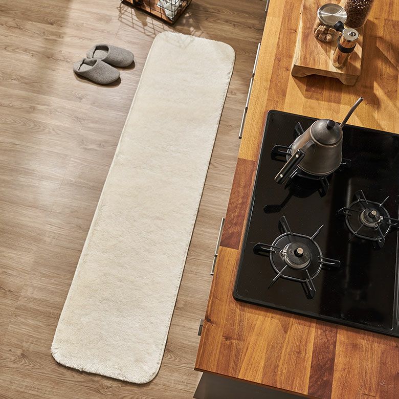 シンプルな無地のキッチンマットは、どんなインテリアにも合わせやすいアイテムです。家具の素材を選ばずにお使いいただけますが、特に自然素材や木材の家具との相性が抜群です。