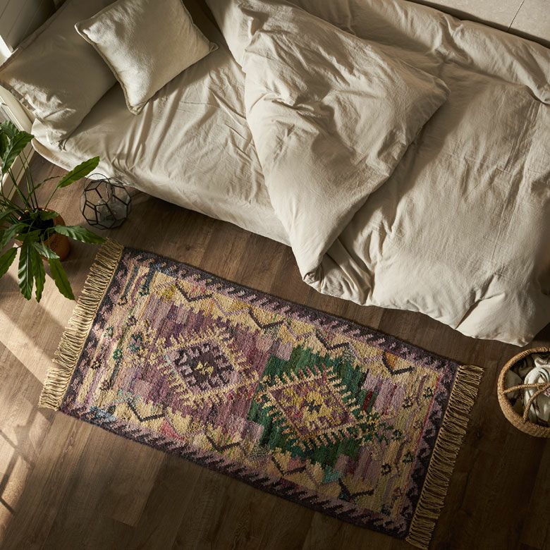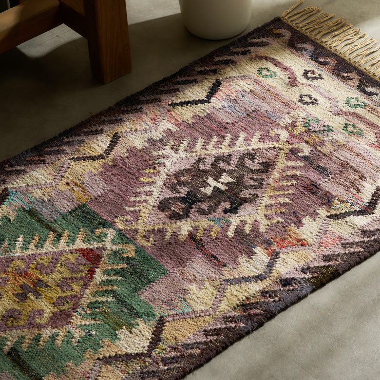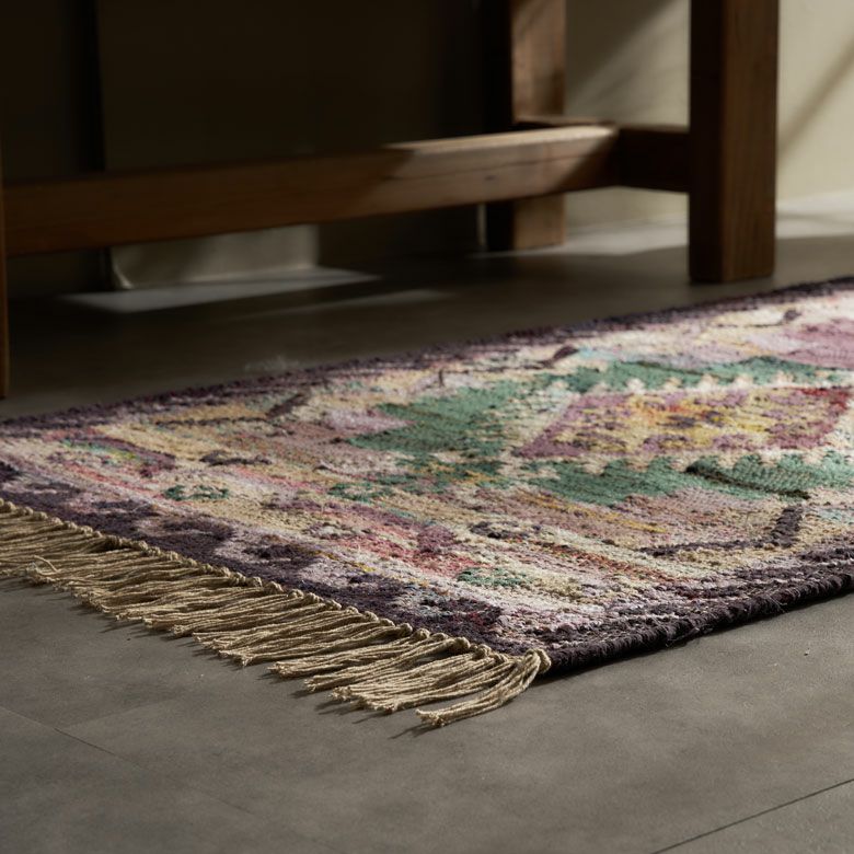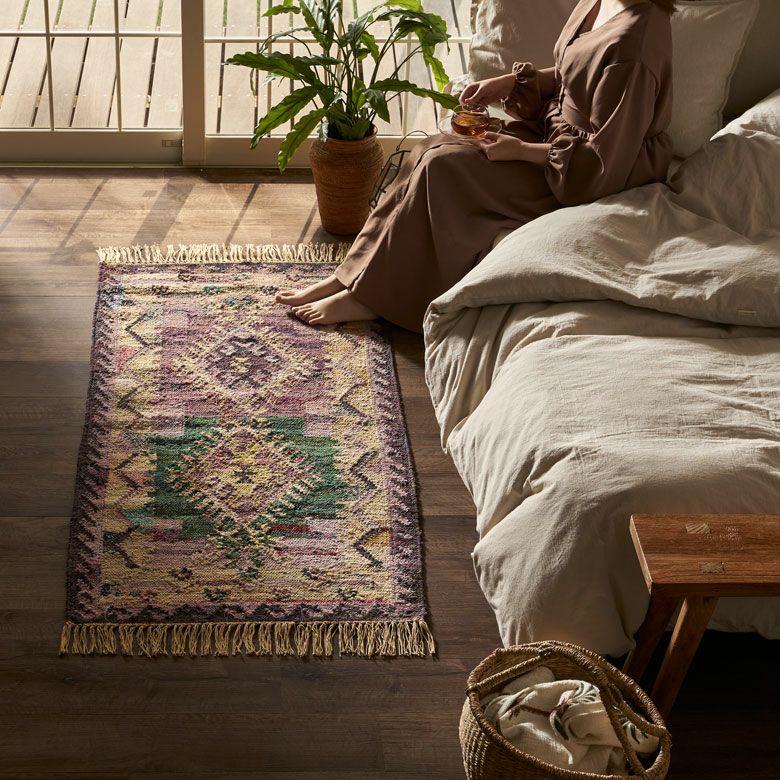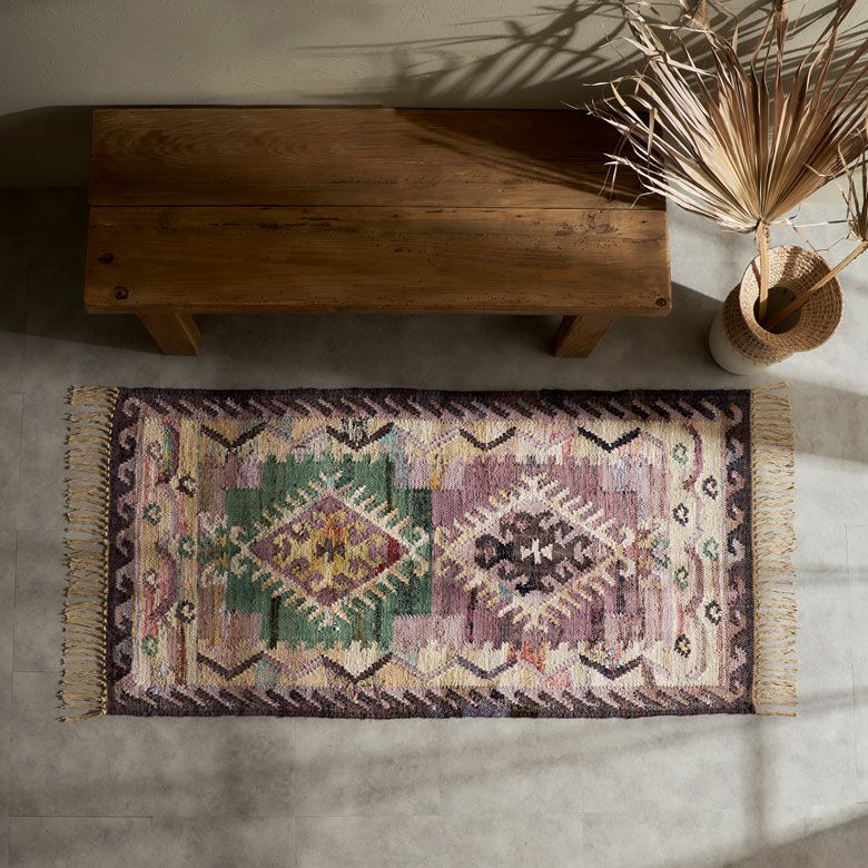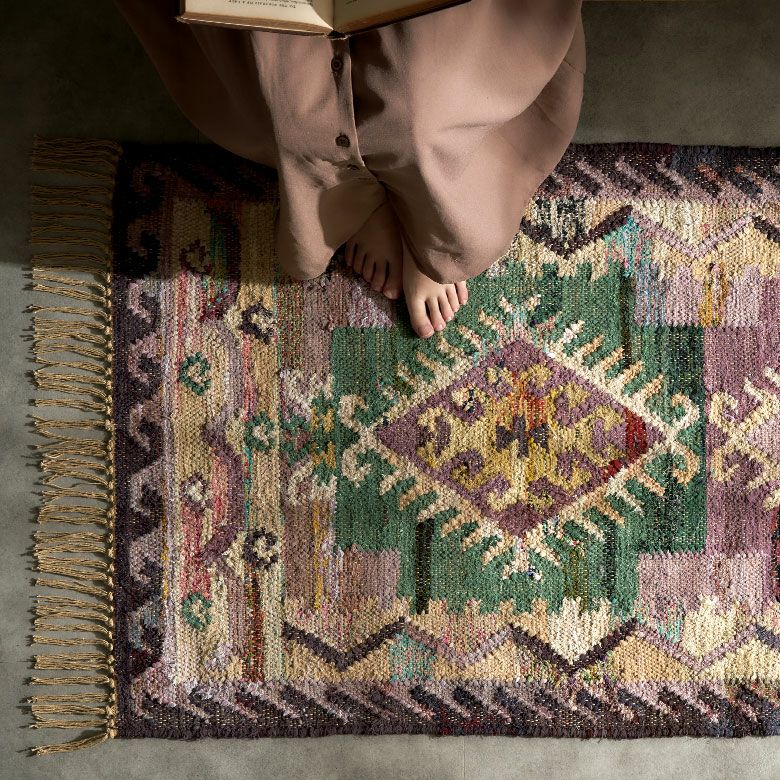大胆な色使いに思わず一目惚れ!環境にやさしいエコなラグ。 リサイクルコットンを使い、インドの伝統的なデザインをパンジャ織りで表現。 お部屋をぐっとおしゃれに演出します。
