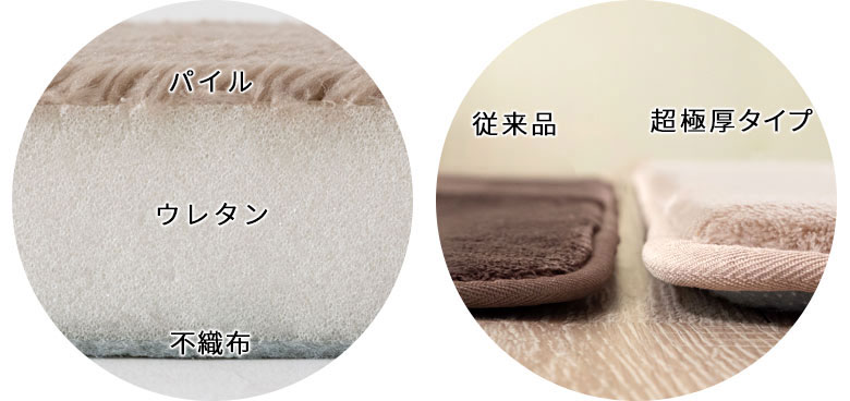 中に厚さ25mmもの分厚いウレタンが入っていて、表面の毛足などを合わせると、その厚さはなんと32mm。 そのため、床を感じることのない快適さ実現しました。