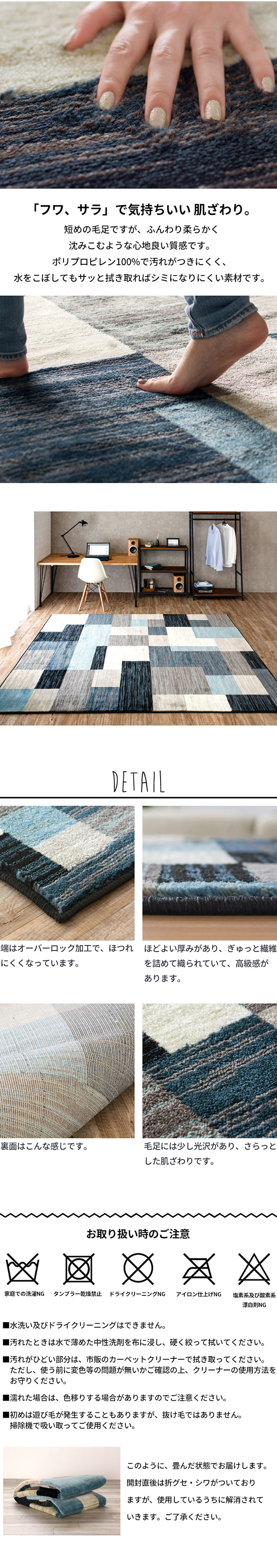 短めの毛足ですが、ふんわり柔らかく 沈みこむような心地良い質感です。 ポリプロピレン100%で汚れがつきにくく、 水をこぼしてもサッと拭き取ればシミになりにくい素材です。