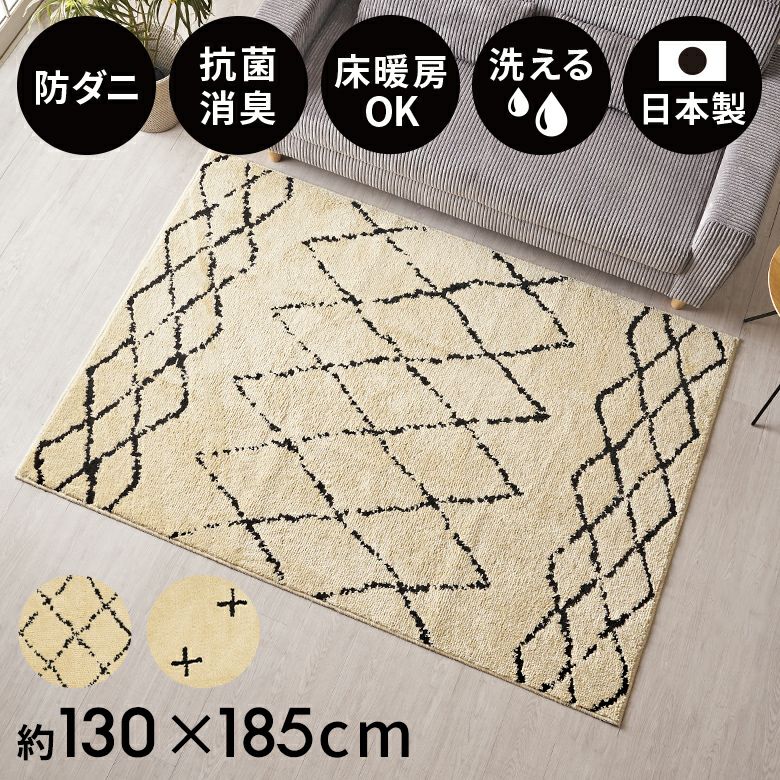 約130×185cmでソファ前に敷くのにちょうどよい定番サイズ。