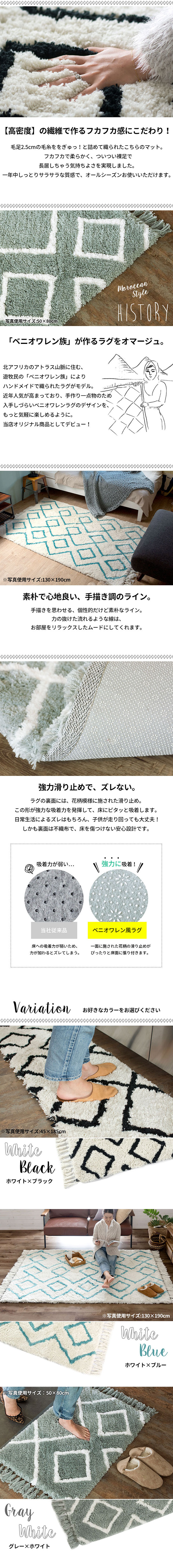 北アフリカのアトラス山脈に住む、 遊牧民の「ベニオワレン族」により ハンドメイドで織られたラグがモデル。 近年人気が高まっており、手作り一点物のため 入手しづらいベニオワレンラグのデザインを、 もっと気軽に楽しめるように。 当店オリジナル商品としてデビュー!