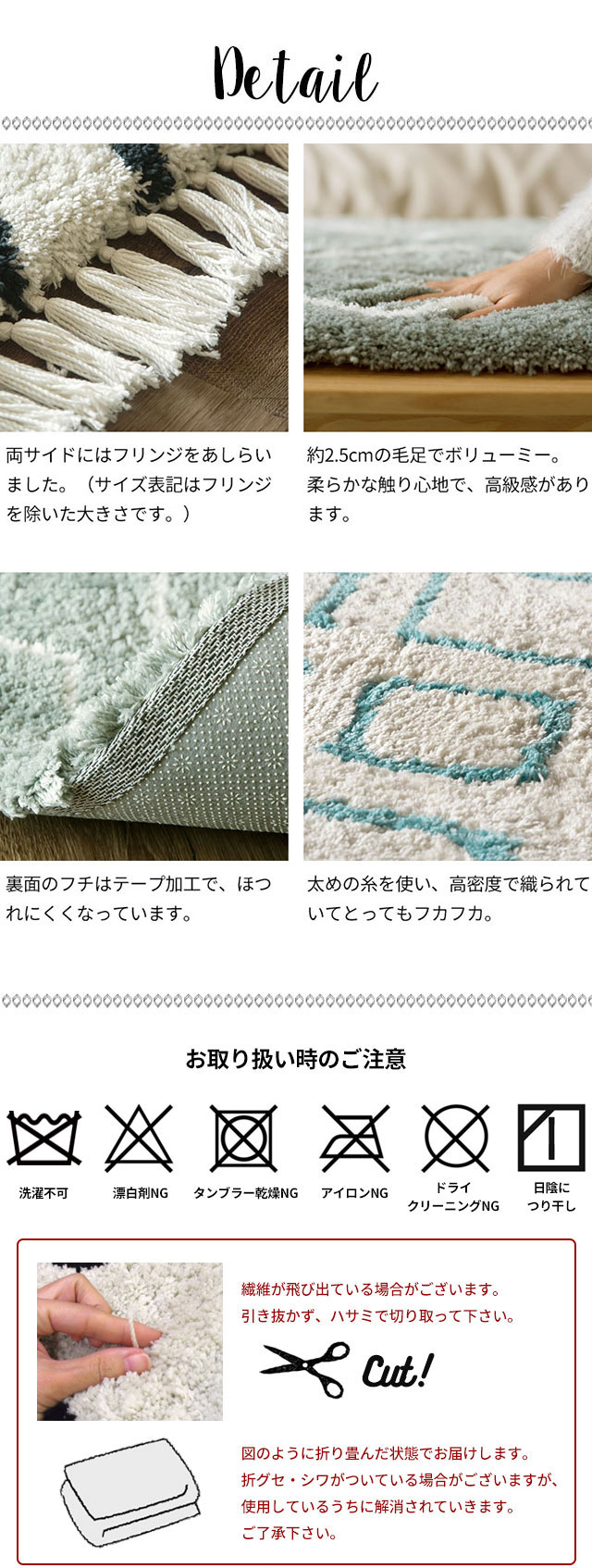 裏面のフチはテープ加工で、ほつれにくくなっています。