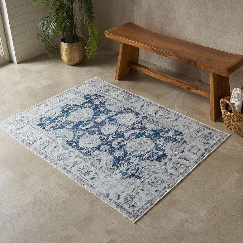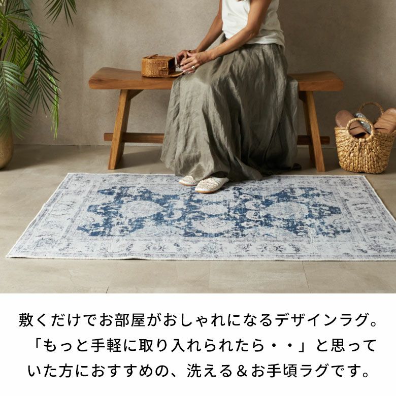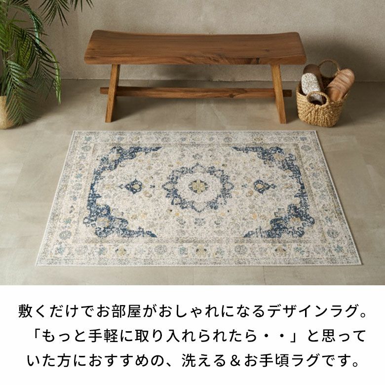 ヴィンテージラグの風合いを“手軽に・清潔に”楽しめる ペルシャ絨毯風ウォッシャブルラグマット!リビングをおしゃれに彩るオリエンタル柄 床暖房対応で年中快適 滑り止め付き 長年使いこんだようなかすれを再現したアンティーク風デザインのおしゃれなラグカーペット/約100x140cm 洗濯機で丸洗いOK 薄手で簡単お掃除&一年中使える 軽くて畳めてラクラク収納ラグマット [84399-e]