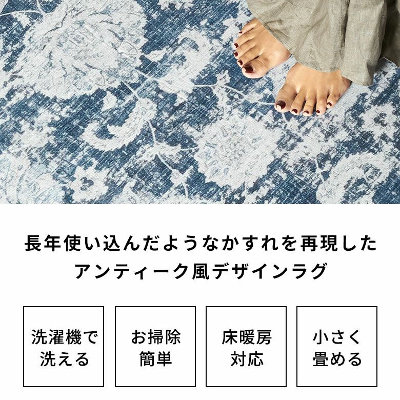 ヴィンテージラグの風合いを“手軽に・清潔に”楽しめる ペルシャ絨毯風ウォッシャブルラグマット!リビングをおしゃれに彩るオリエンタル柄 床暖房対応で年中快適 滑り止め付き 長年使いこんだようなかすれを再現したアンティーク風デザインのおしゃれなラグカーペット/約200x250cm 洗濯機で丸洗いOK 薄手で簡単お掃除&一年中使える 軽くて畳めてラクラク収納ラグマット [84401-e]