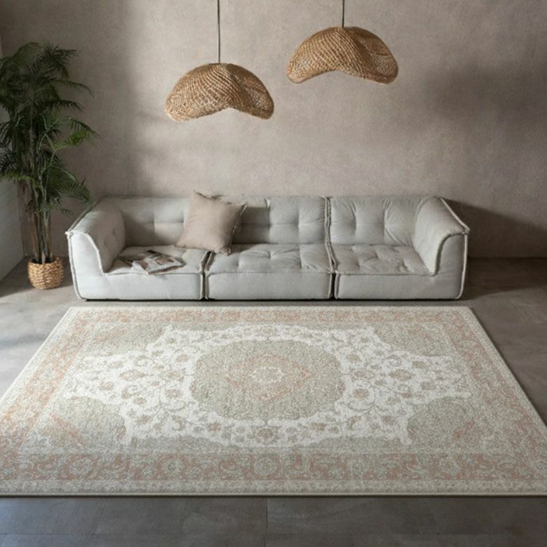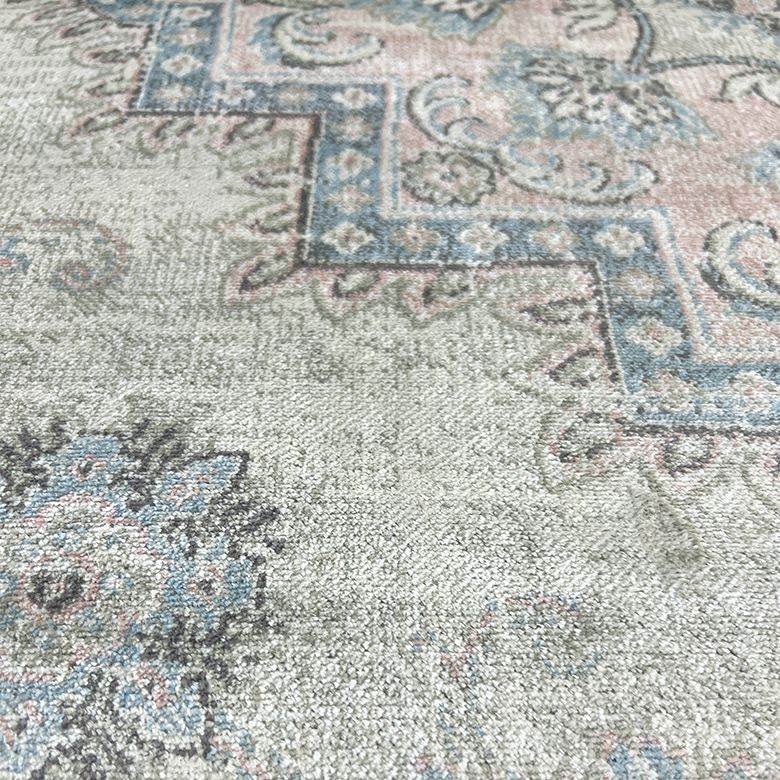 ヨーロッパらしい洗練されたデザインと美しい発色が魅力のRAGOLLEモケット織りラグ おしゃれで高級感あふれるヨーロッパ・ベルギー製モケット織りラグマット シルクのような肌触りの優美なパステルカラーが咲くナチュラルなかすれが素敵なビンテージ風メダリオンデザイン ホットカーペット対応&薄手で軽量 夏もOKのオールシーズン用 / 約135x195cm(84389)