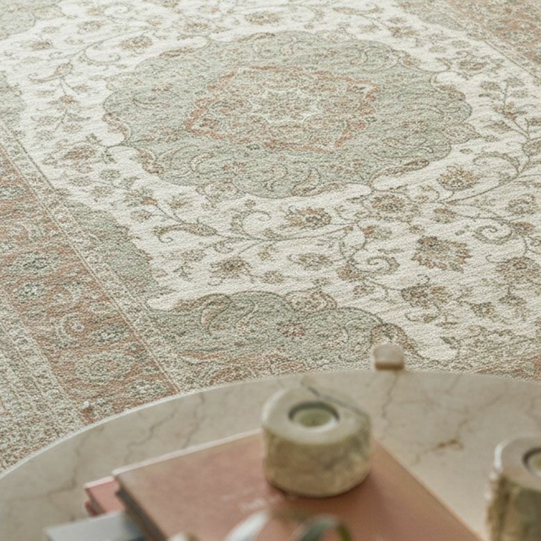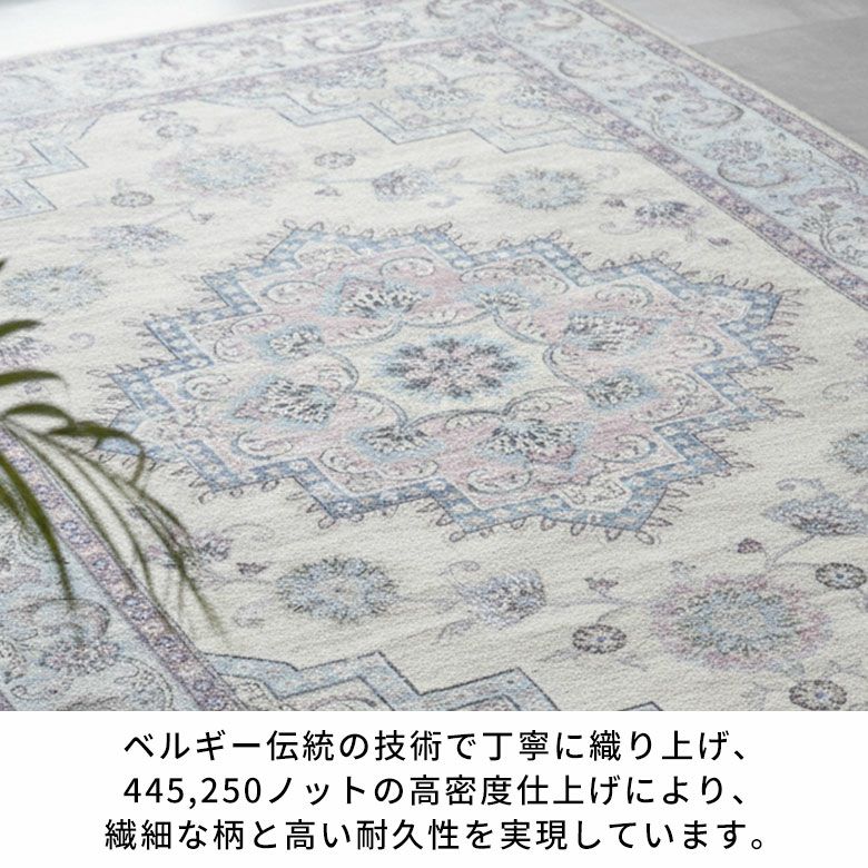ヨーロッパらしい洗練されたデザインと美しい発色が魅力のRAGOLLEモケット織りラグ おしゃれで高級感あふれるヨーロッパ・ベルギー製モケット織りラグマット シルクのような肌触りの優美なパステルカラーが咲くナチュラルなかすれが素敵なビンテージ風メダリオンデザイン ホットカーペット対応&薄手で軽量 夏もOKのオールシーズン用 / 約195x250cm(84390)