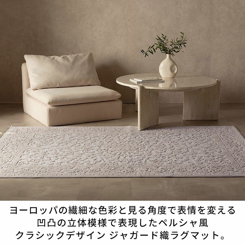 モノトーンやシンプルモダンなインテリアに敷くだけで、ジャガード織ラグならではの立体的な凹凸模様が上質な華やかさをプラス。