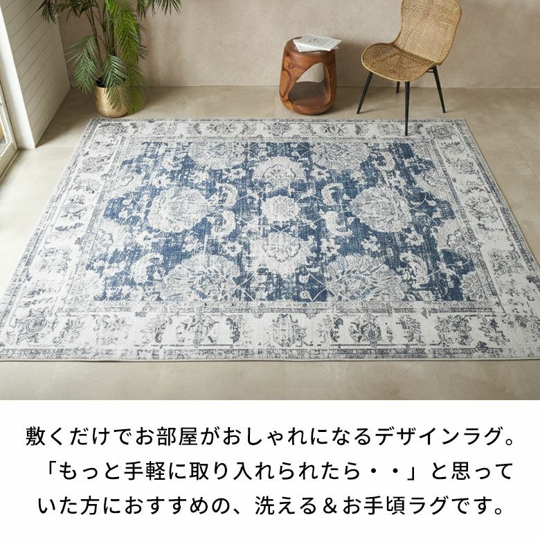 ヴィンテージラグの風合いを、“手軽に・清潔に”楽しめるラグマット。繊細な模様と深みのある色合いを転写プリントでリアルに再現し、本物のような重厚感と高級感を実現しました。