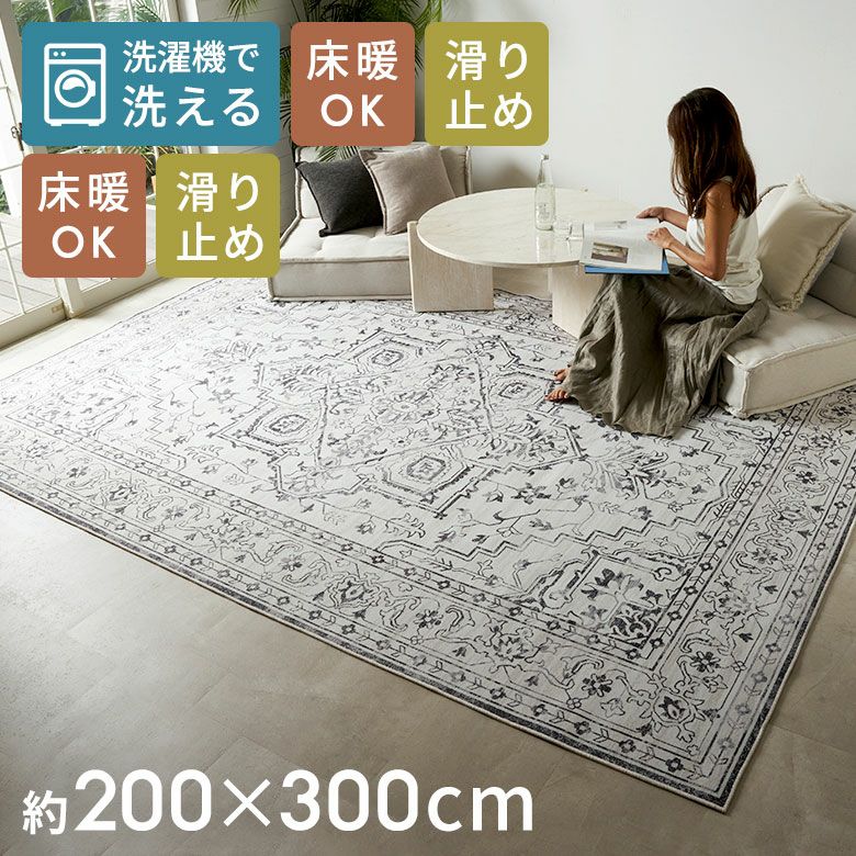 落ち着きと優雅さのあるグレーとホワイトで、草花や幾何学模様を描いた上品なデザイン。繊細なメダリオン柄が空間にリズムを生み出します。シックで洗練された印象を与え、モノトーンインテリアや北欧スタイルにもよくなじみます。