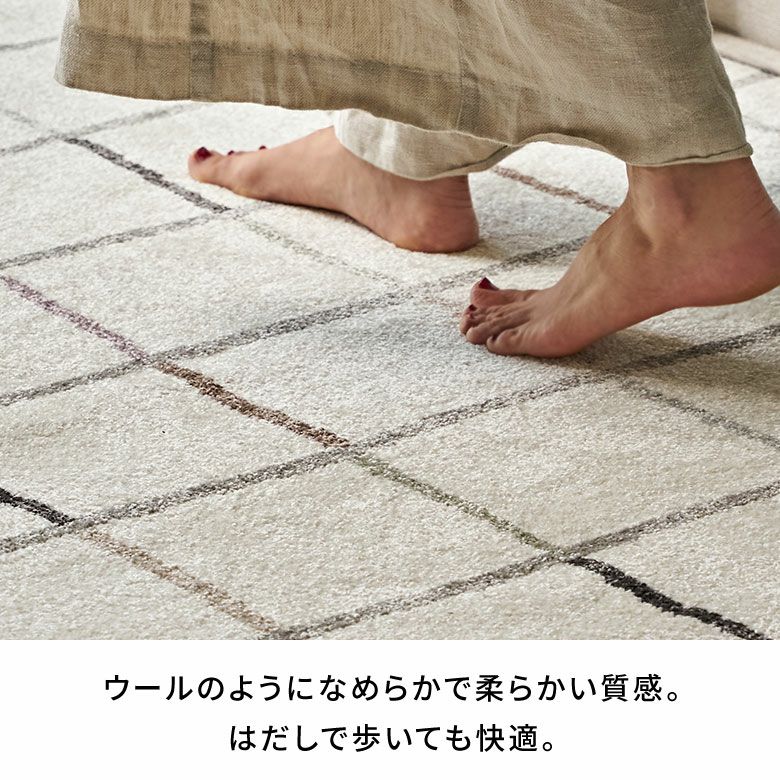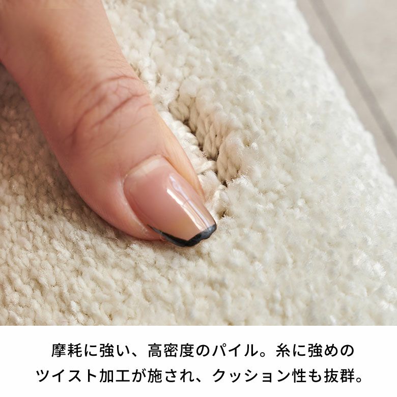 糸を贅沢に使ったウィルトン織は、密度が高くとても丈夫。素材には耐久性が高いポリプロピレンを使用しているため、長く愛用できます。ウールのようになめらかで柔らかいソフトタッチ仕上げで、はだしで歩いても快適。さらに、こちらのラグは糸に強めのツイスト加工をかけており、踏みごたえも抜群です。