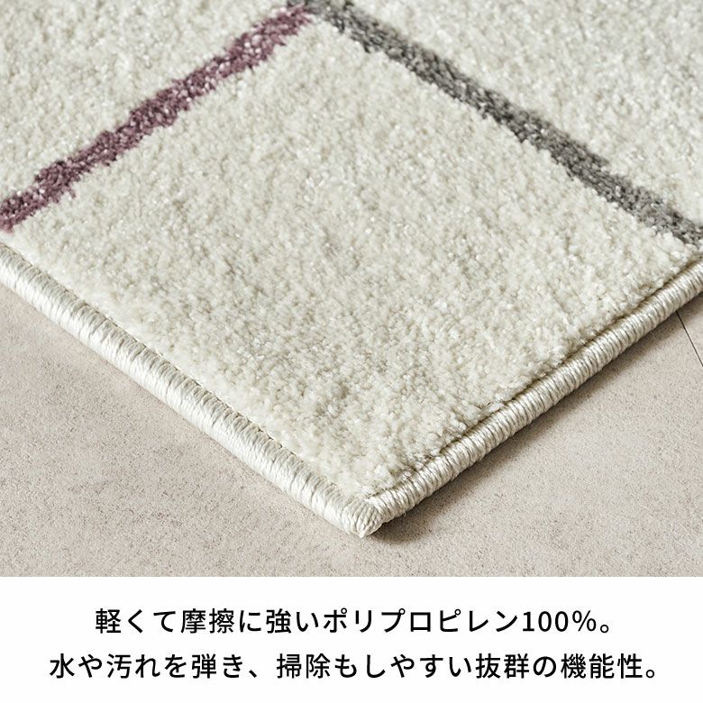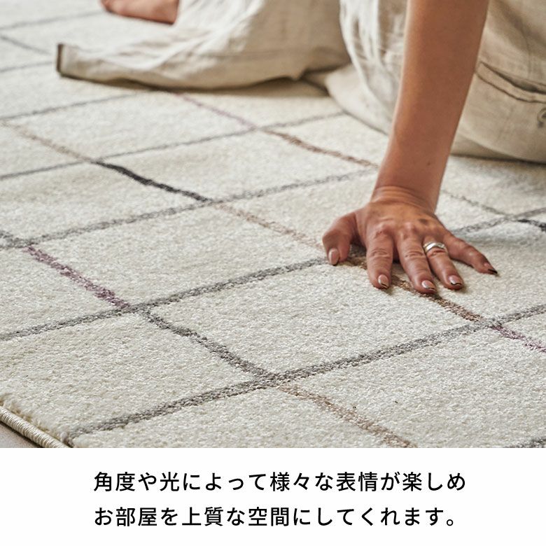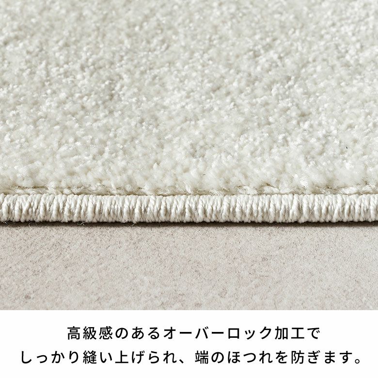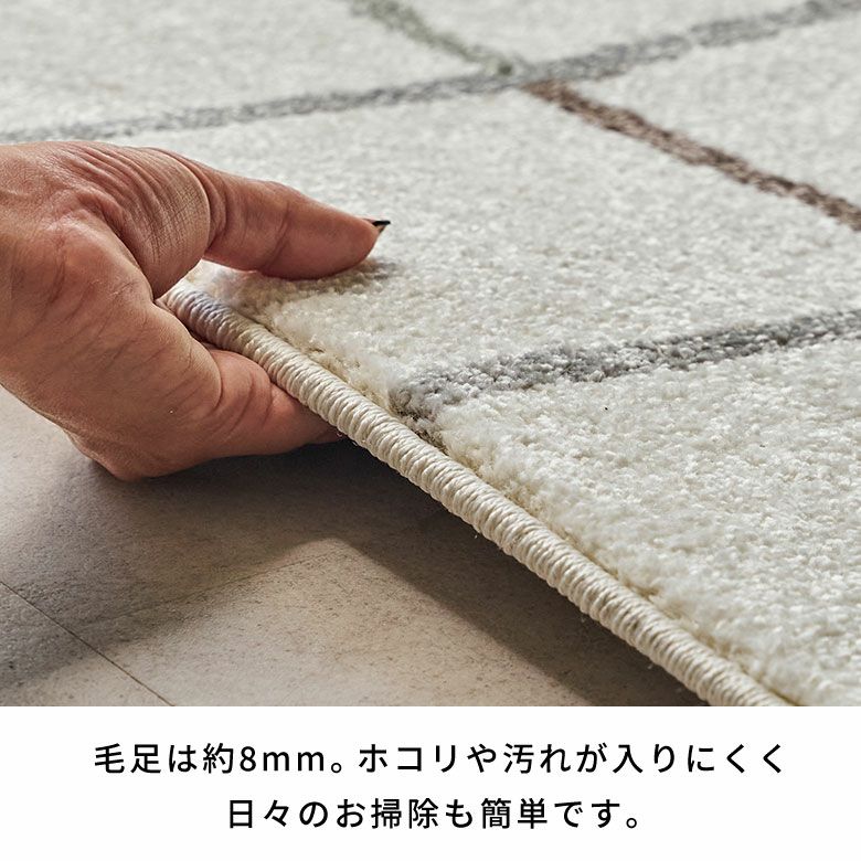 遊び毛や抜け毛が少ないのが特徴。また、毛足の密度が高くゴミやホコリが奥に入りにくいため、日々のお手入れは掃除機をかけるだけで清潔に保てます。