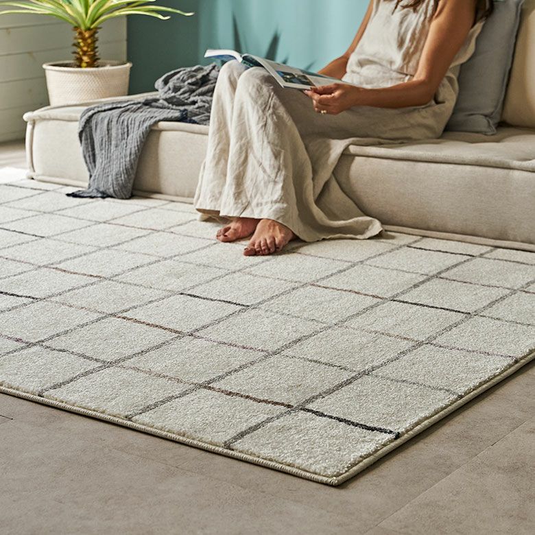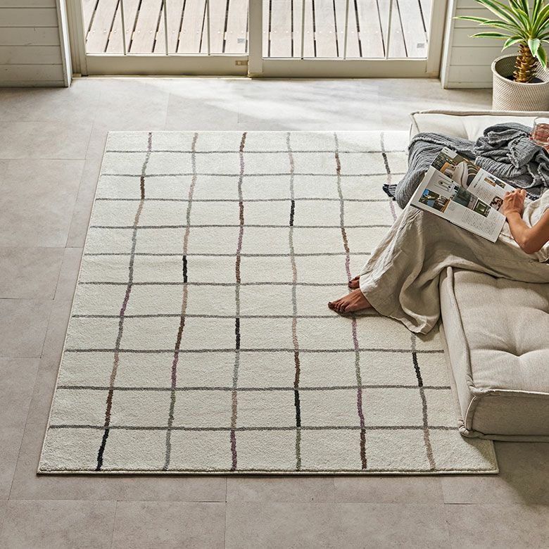 ミニマルなデザインやモノトーン中心のインテリアの中に、ラグのカラフルなグリッド線が程よい柔らかさを加えます。