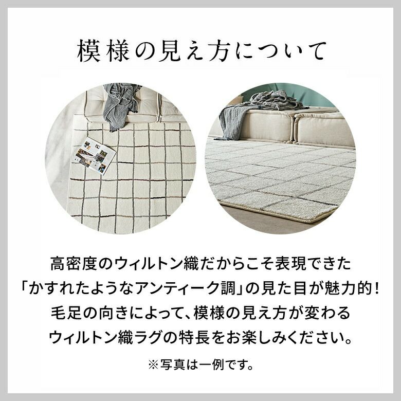 一方、ウィルトン織ラグは、色付きのパイル糸を組み合わせて模様を作るため、 発色が美しく色褪せにくいのが特徴です。さらに、光の当たり方や見る角度によって陰影が生まれ、立体感のある美しいデザインを楽しめます。