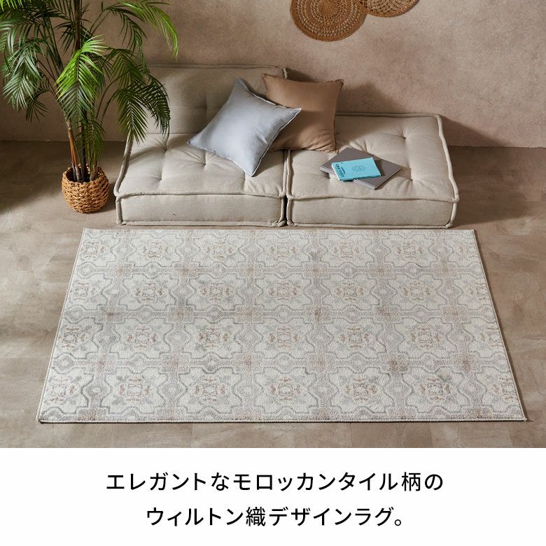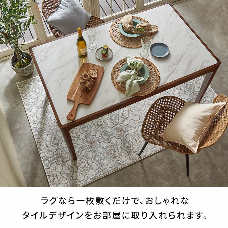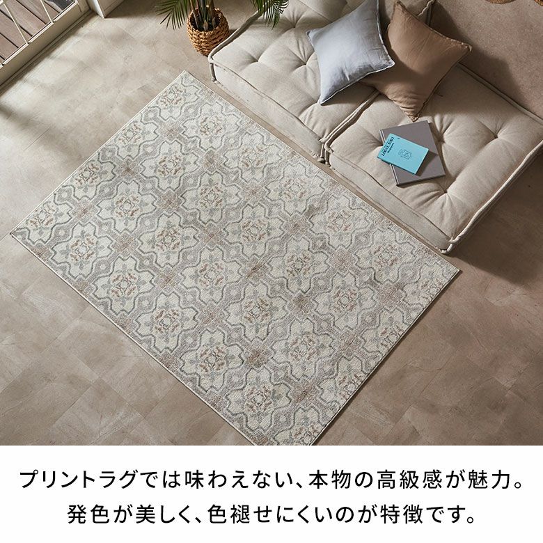 エレガントなモザイクタイルを思わせる幾何学模様に、やわらかなフラワーモチーフを組み合わせたデザインのラグ。伝統的なモザイク柄を淡く落ち着いた色合いで表現しました。軽やかでありながら上品な雰囲気で、アジアンリゾートからシャビーシックまで、幅広いスタイルにマッチ。ラグなら一枚敷くだけでタイルデザインを簡単に取り入れることができ、お部屋の印象をぐっと魅力的に変えてくれます。