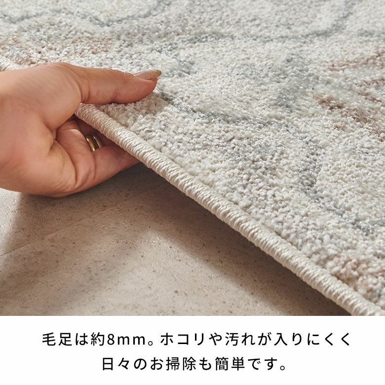 遊び毛や抜け毛が少ないのが特徴。また、毛足の密度が高くゴミやホコリが奥に入りにくいため、日々のお手入れは掃除機をかけるだけで清潔に保てます。