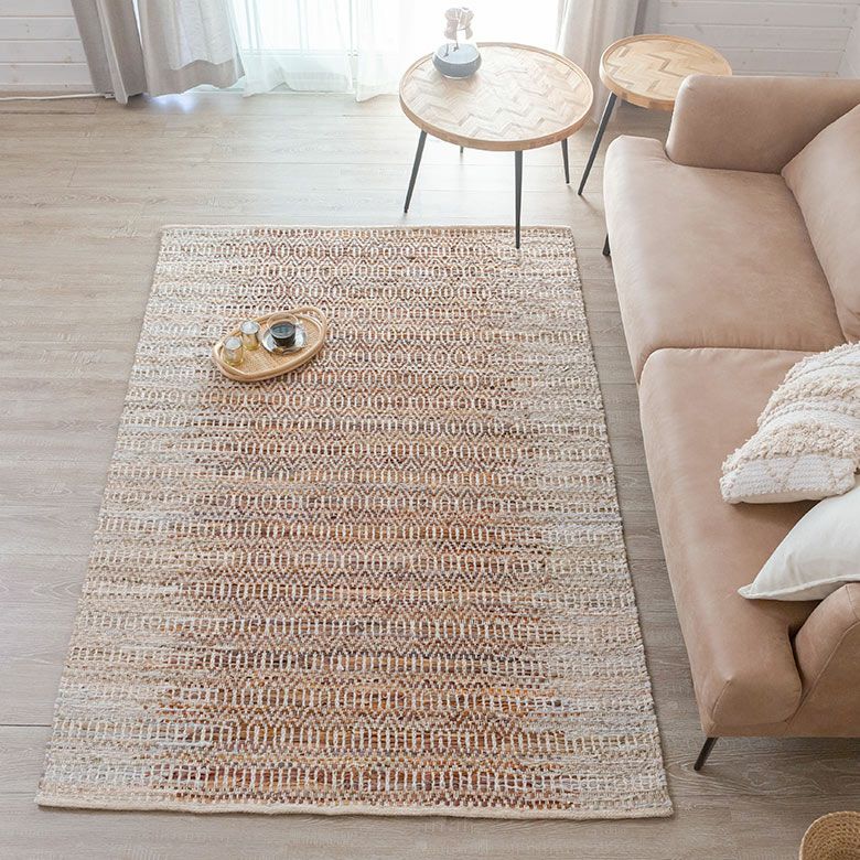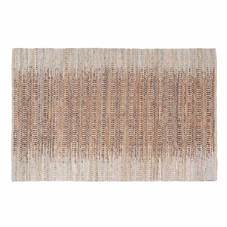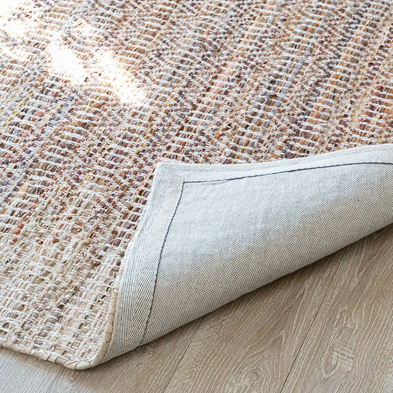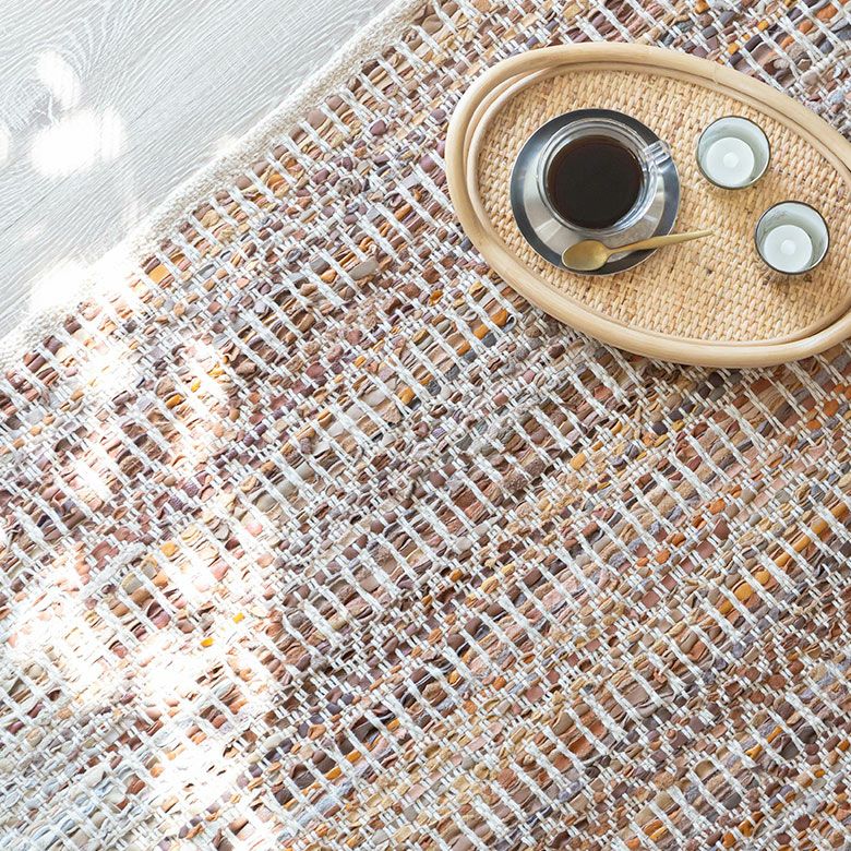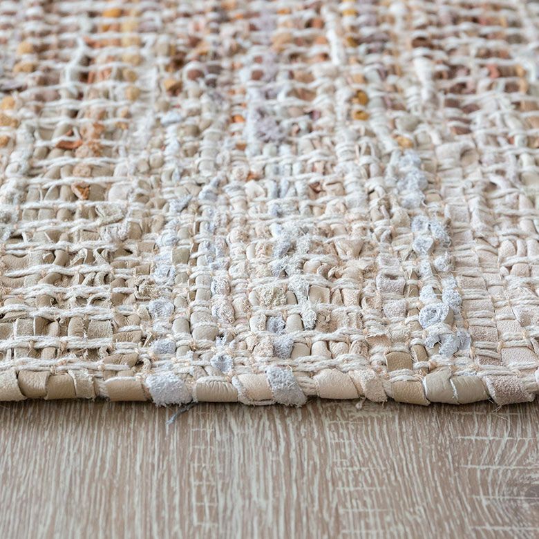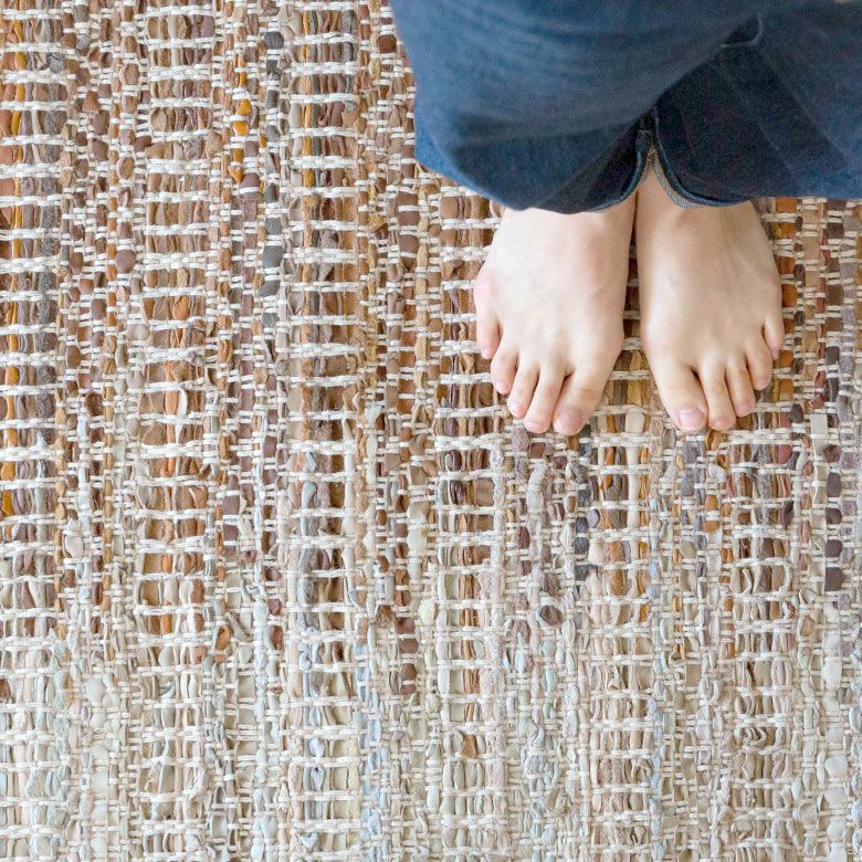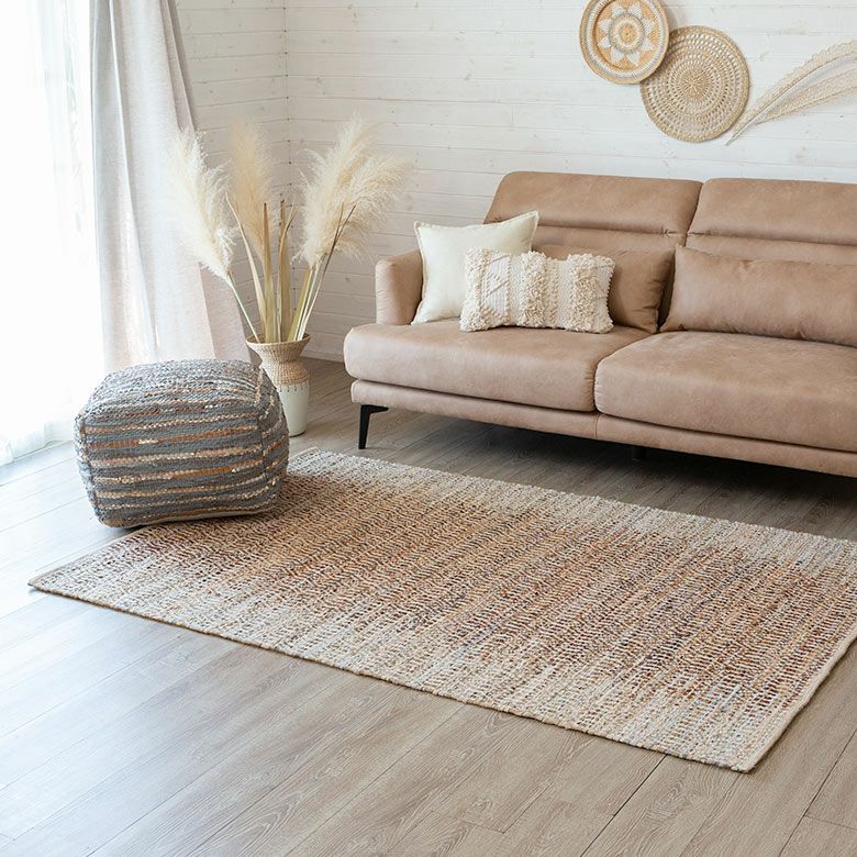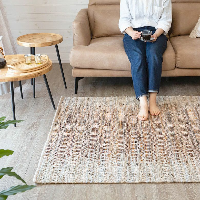 素朴でざっくりと織られたやさしい風合いのデザインラグ。 吸湿性と耐久性が高いレザーと通気性の良いジュートを織り交ぜており、 柔らかな肌さわりで季節を問わず快適にお使いいただけます。
