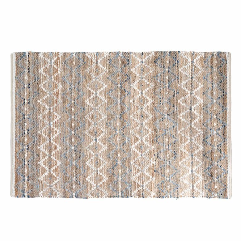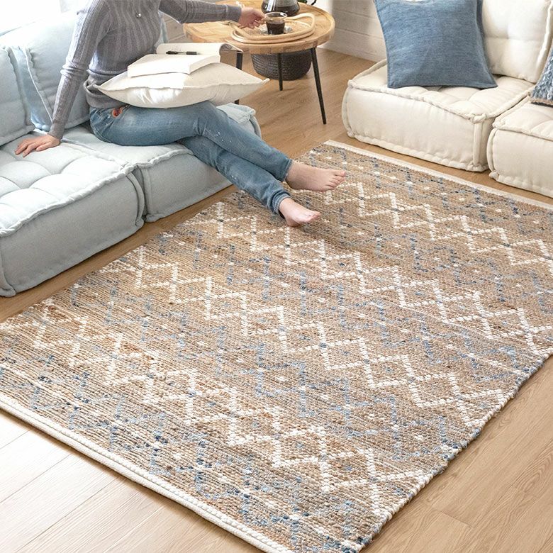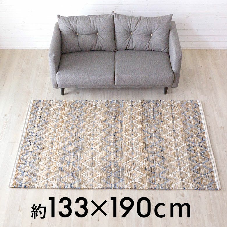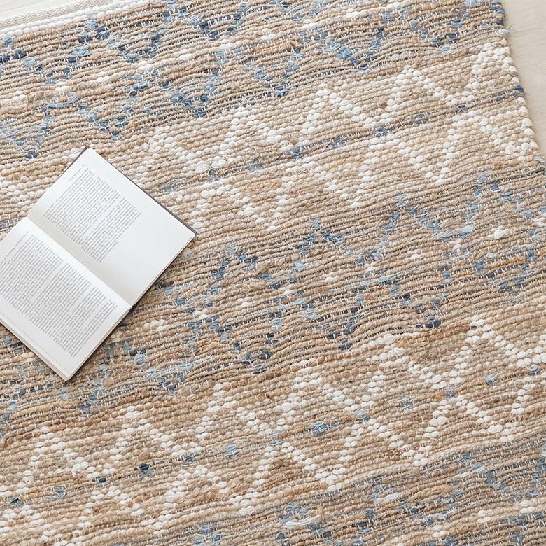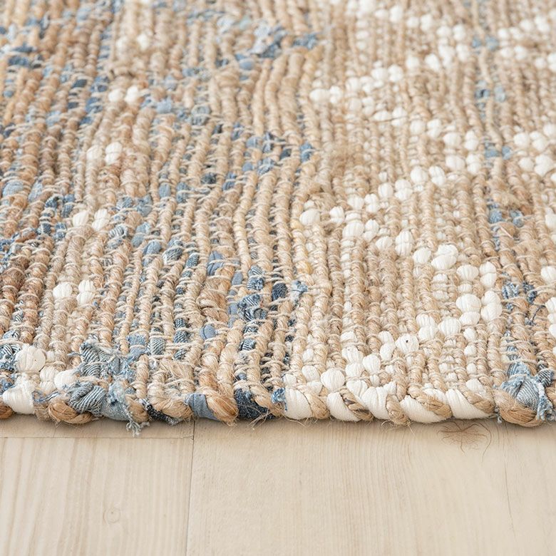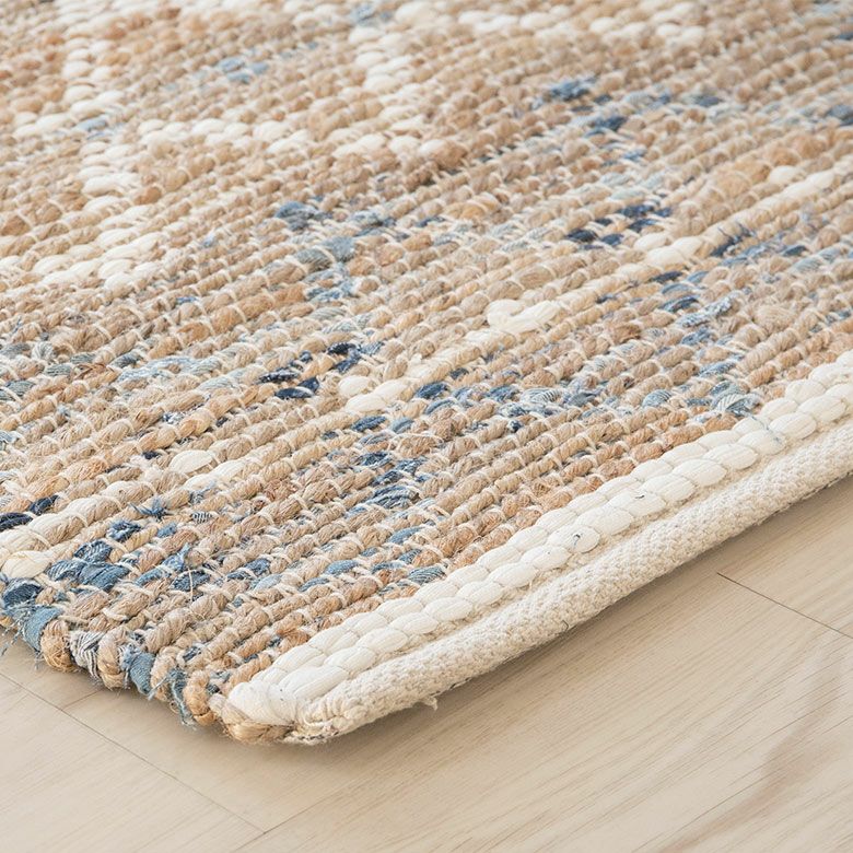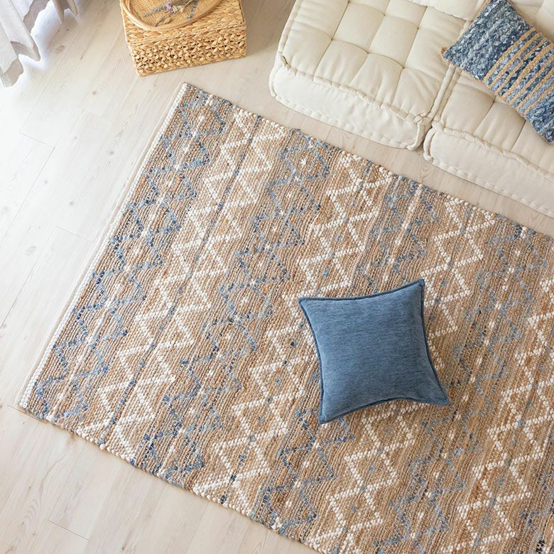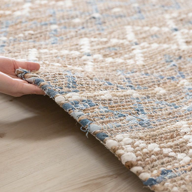 職人の手作業によっておられたラグは、 ところどころ編み目に凹凸がありぬくもりが感じられるポイント。 裂いたデニム・ホワイトコットン生地・ジュートを編み込み ポコポコとした模様からなる織地は、感触もユニーク。