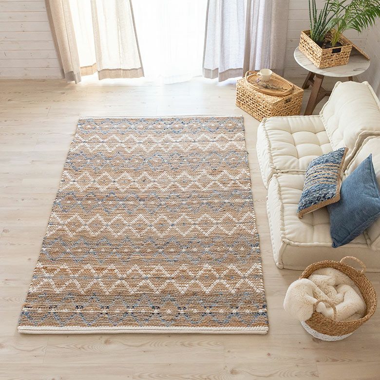 ジュートのナチュラル感にコットンをプラスして、 ざっくりしすぎず柔らかな質感のラグです。 天然素材の良さとデザイン性の高さを兼ね備えており、 くたっとした風合いでリラックス感がありつつ、 落ち着いた深みのある色合いで、上品に仕上げました。 BOHOテイストやコースタルスタイルの さりげないアクセントとしても活躍しそう。