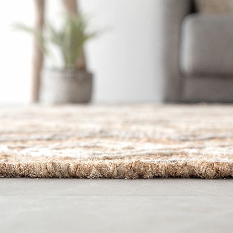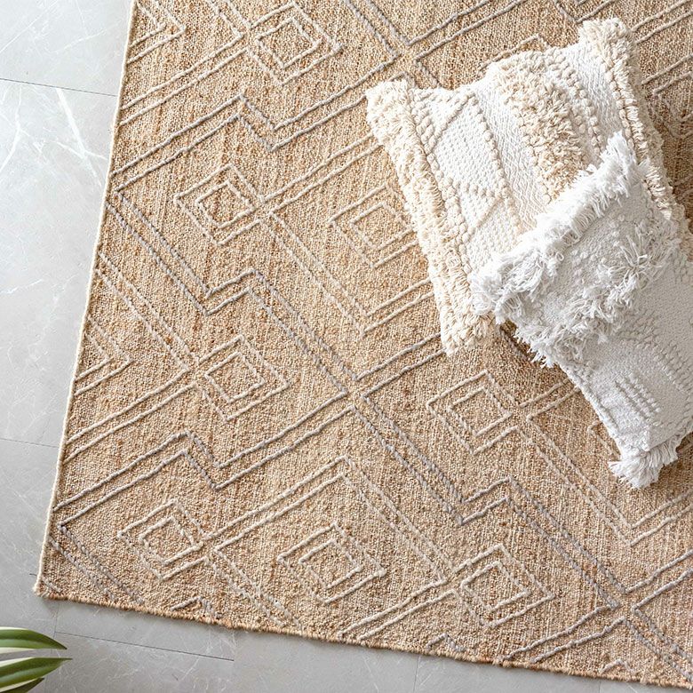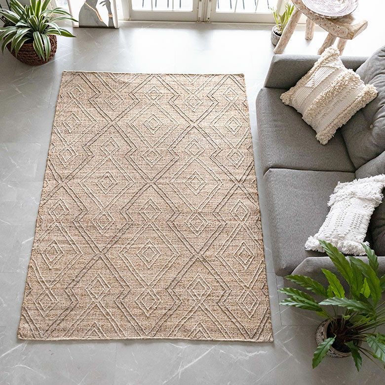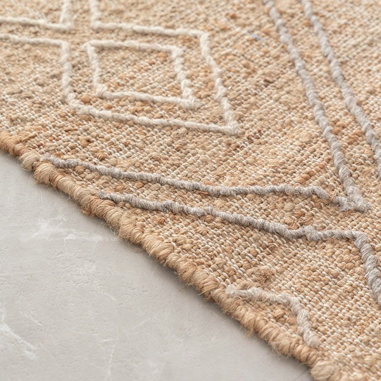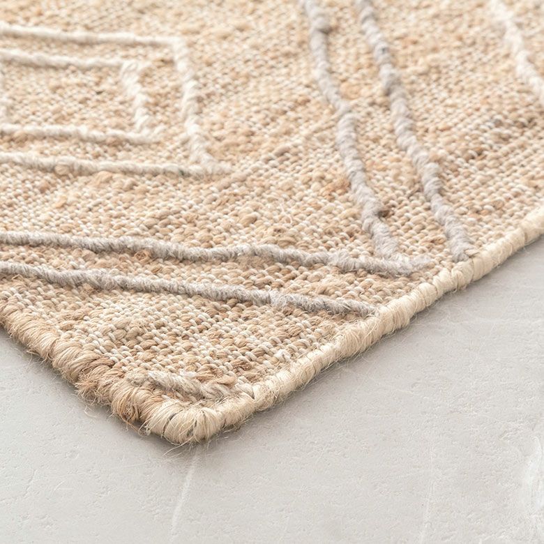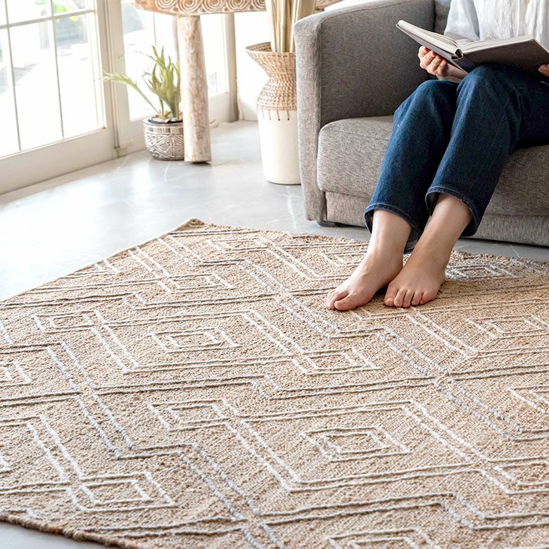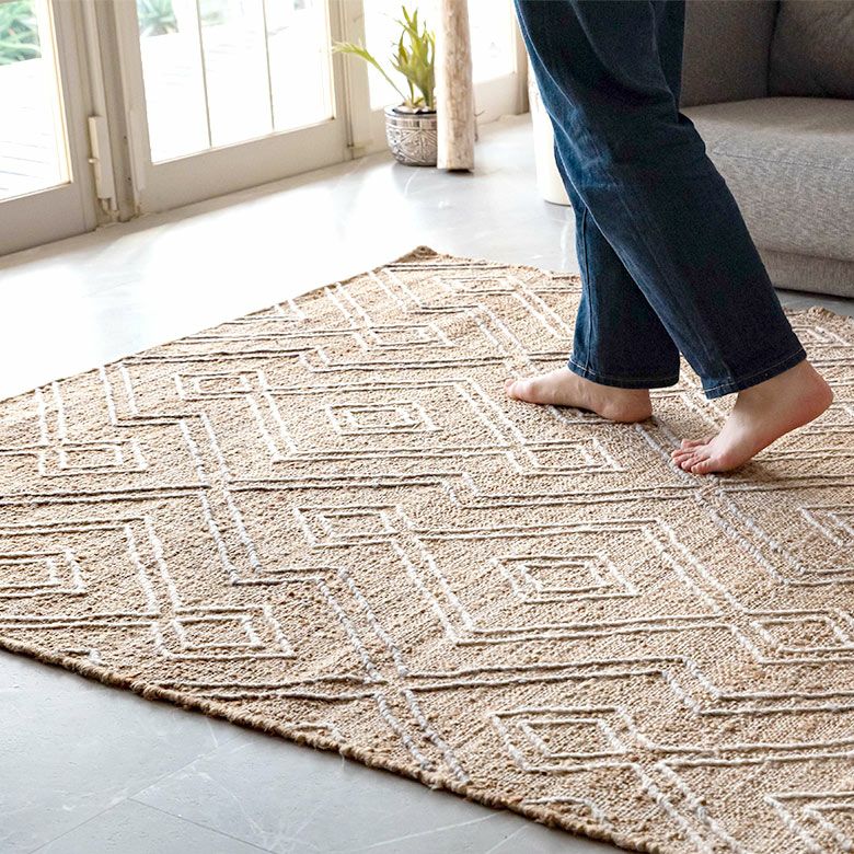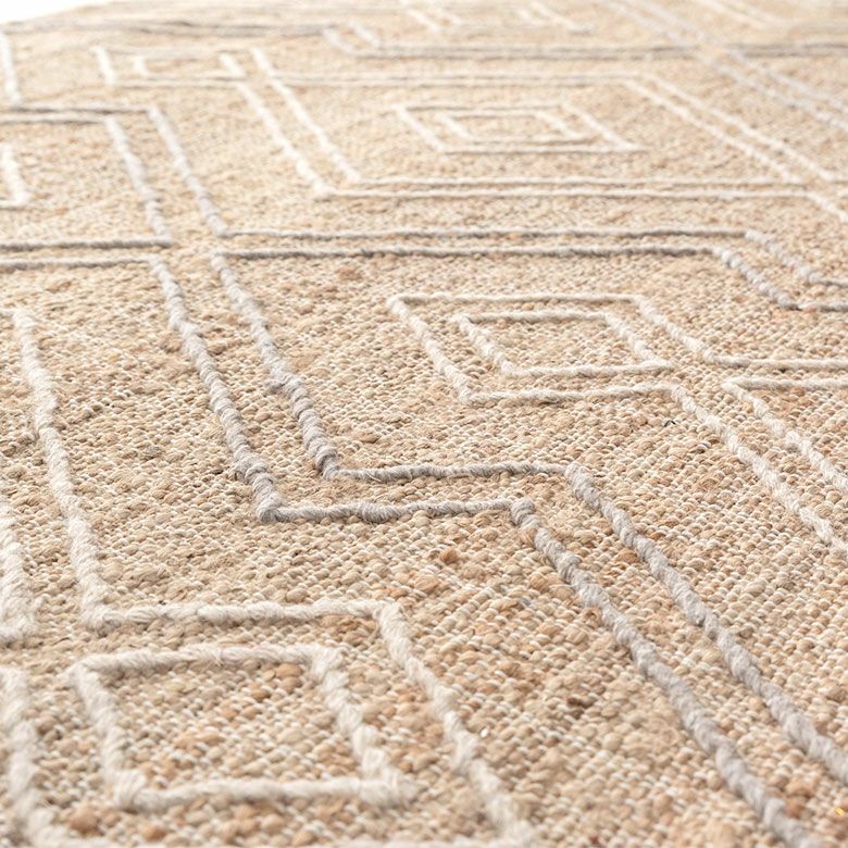 素朴でざっくりと織られたやさしい風合いのデザインラグ。 通気性の良いジュートにウールを織り交ぜており、 柔らかな肌さわりで季節を問わず快適にお使いいただけます。