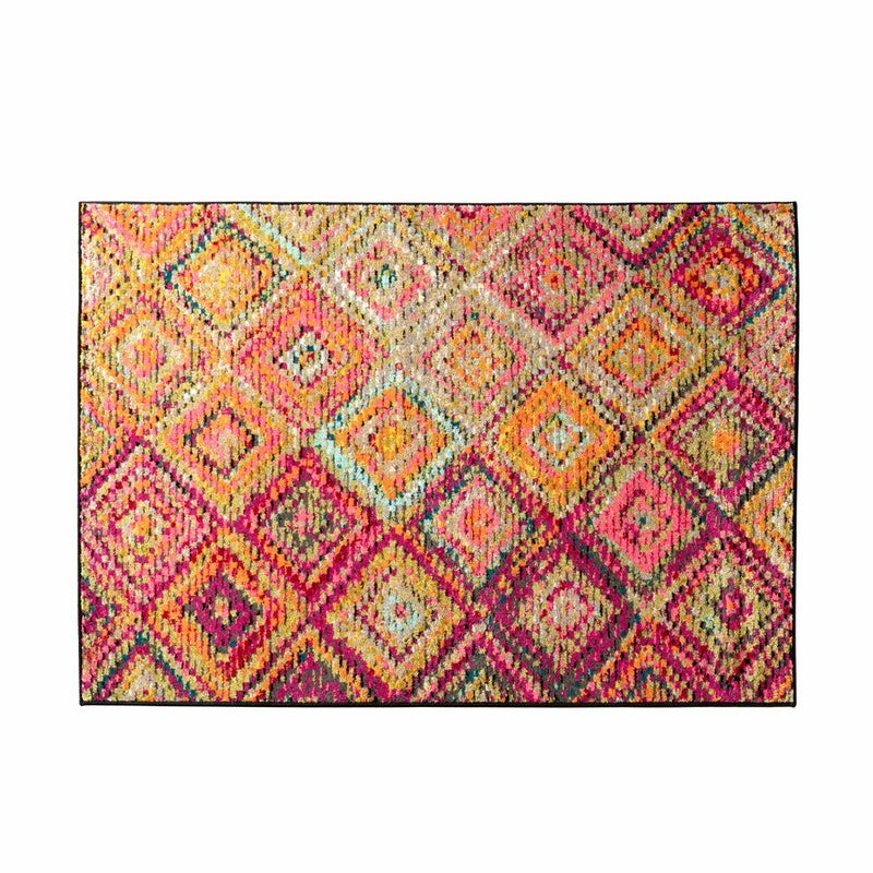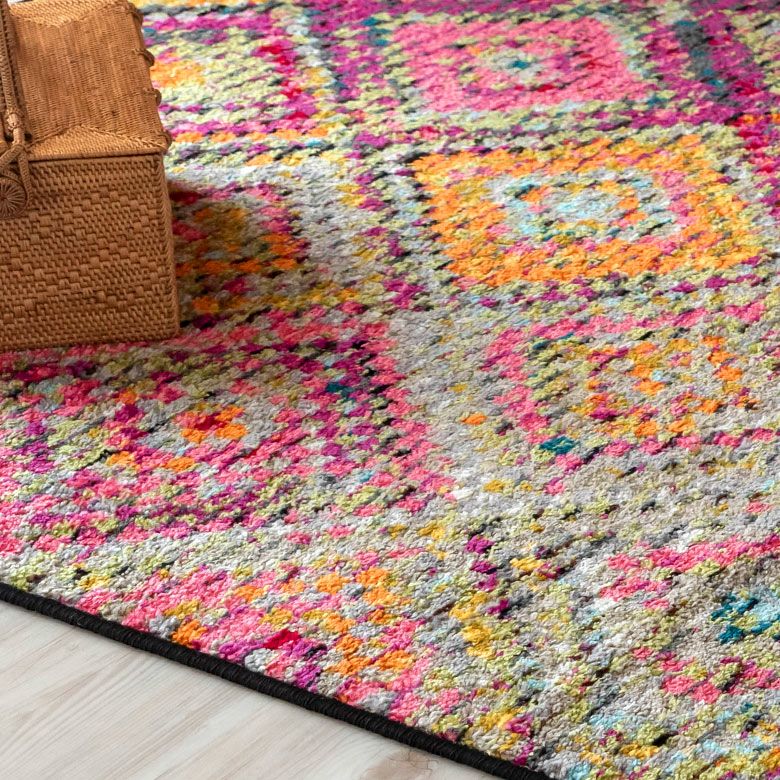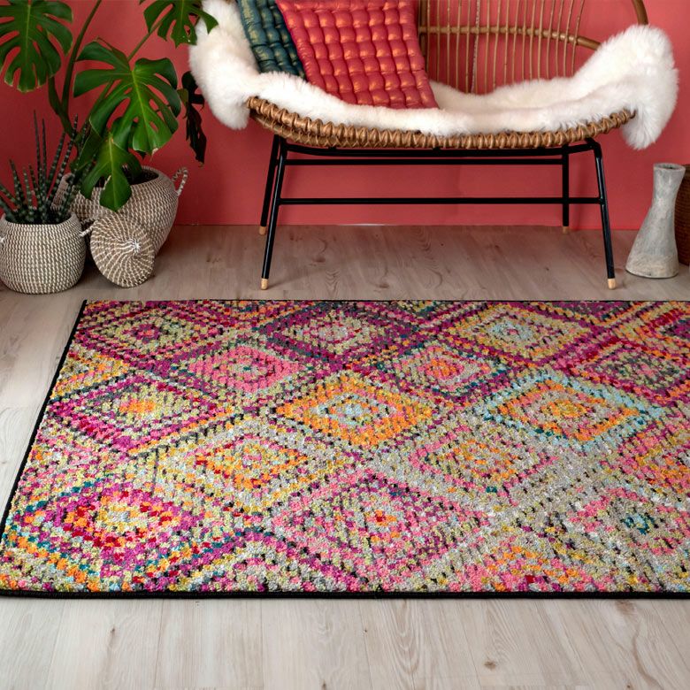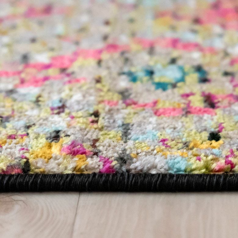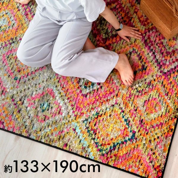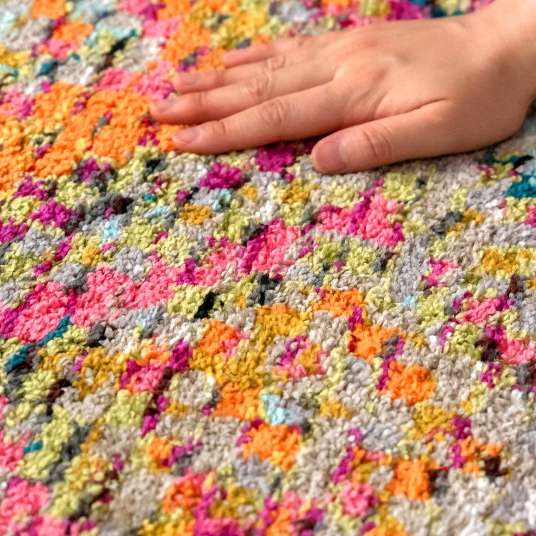 カラフルカラーの糸が織り交ざった、 敷くだけで華やかな雰囲気になるデザインラグ。 明るい印象のカラフルモロッカンや ボーホースタイルコーデにぴったり! 短めの毛足ですが、ふんわり柔らかく 沈みこむような心地良い質感です。