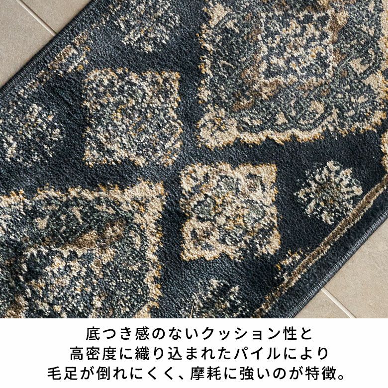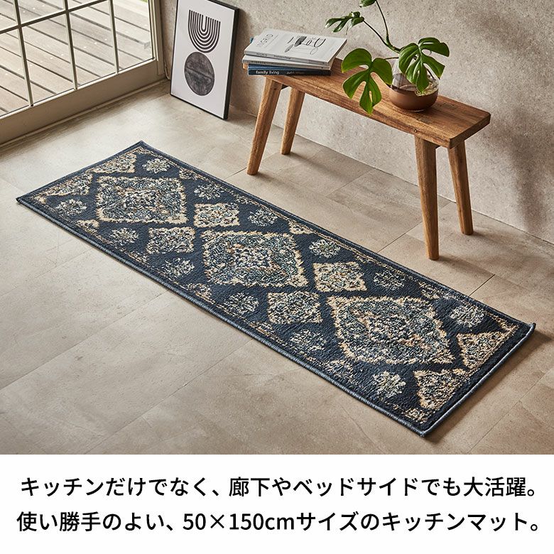約50×150cmの手頃なサイズ感のキッチンマット。キッチンはもちろん、廊下やベッドサイドにもおすすめで、自由なコーディネートをお楽しみいただけます。アラベスク柄の主張しすぎない“擦れ感”が、この商品ならではの魅力。