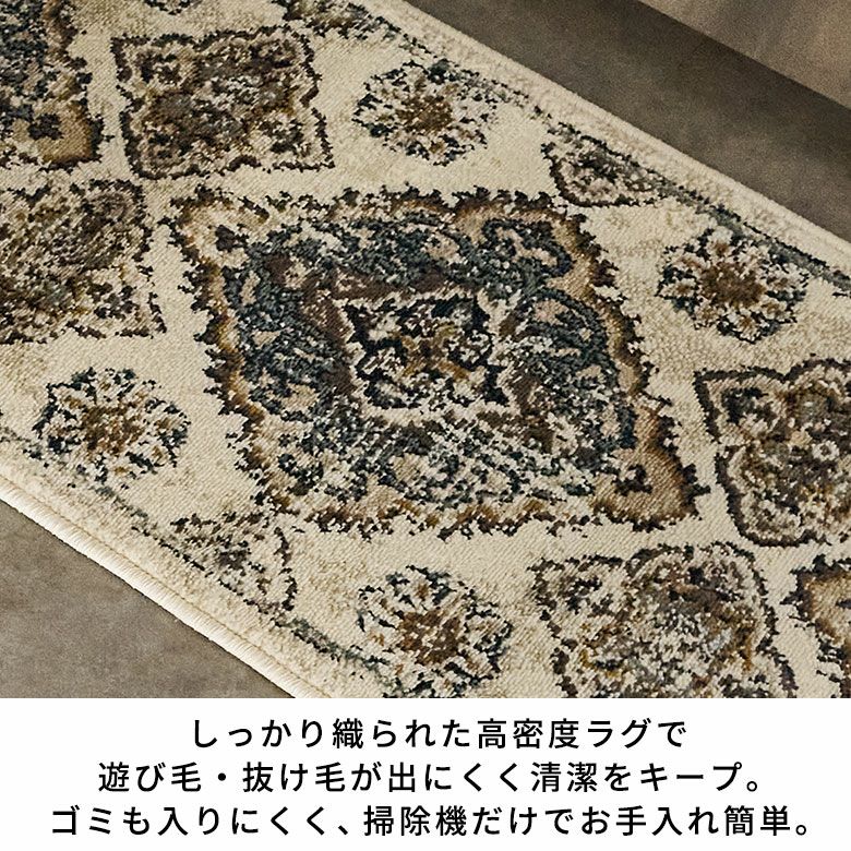 このラグは、パイル糸を複数の糸で交差するようにしっかりと織り込まれているため、プリントラグやシャギーラグ、マイクロファイバーラグに比べて、遊び毛や抜け毛がないのが特徴。また、毛足の密度が高くゴミやホコリが奥に入りにくいため、日々のお手入れは掃除機をかけるだけで清潔を保つことができます。