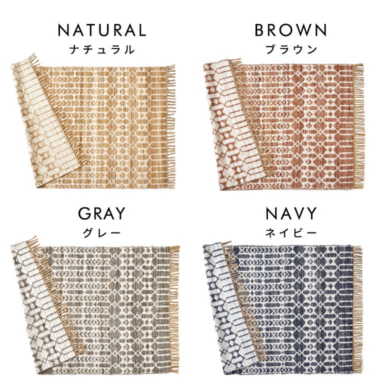 ふわふわやわらかなコットンシェニールと 爽やかでスタイリッシュな印象のジュート素材をミックスした 異素材の甘辛なコンビネーションで、お部屋にスパイスを。 麻の一種で、丈夫でしっかりとした素材感のジュート50%と 気持ちの良いふんわりとした触り心地のコットンシェニールを50%使用しています。 シェニール部分は気持ちの良いふんわりとした触り心地。 カラーはナチュラル、ブラウン、ネイビー、グレーの4色展開。 ジオメトリック柄が心地よいカラーリングで、お部屋によく馴染みます。 表面と裏面で柄の色が反転するので、お好みや気分に合わせて2WAYでお使いいただけます。 天然素材ラグ一覧へ >
