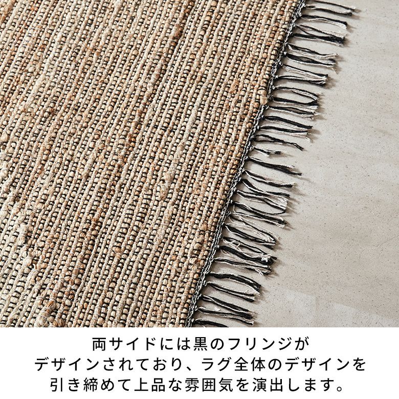 インドの職人が大型の織り機を用いて丁寧に作り上げたジュートラグ。天然素材のジュート100%で織られたハンドメイドラグのため、色の濃淡や風合いがそれぞれ異なる一点もの。ジュート素材の自然な風合いを生かしたベージュとライトブラウンのカラーが、お部屋にやさしい温もりを添えます。両サイドには黒のフリンジが付いており、ラグ全体のデザインを引き締めて上品な雰囲気を演出します。