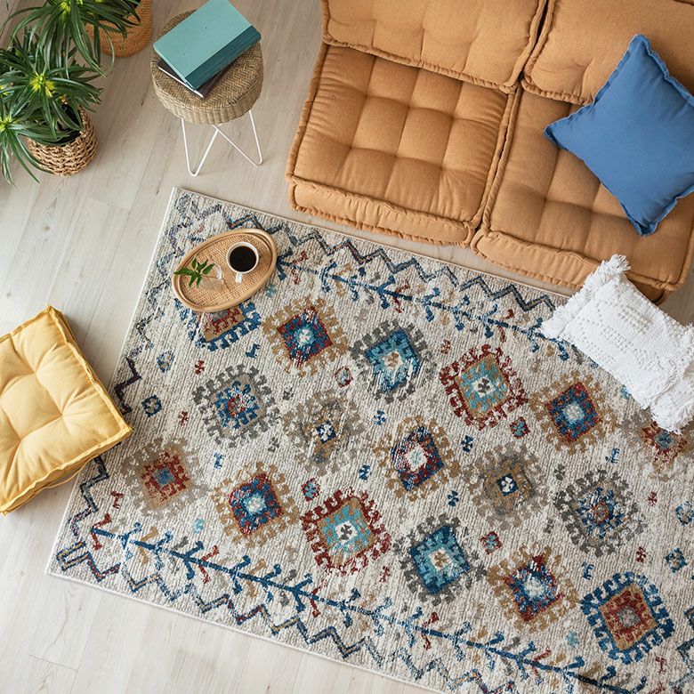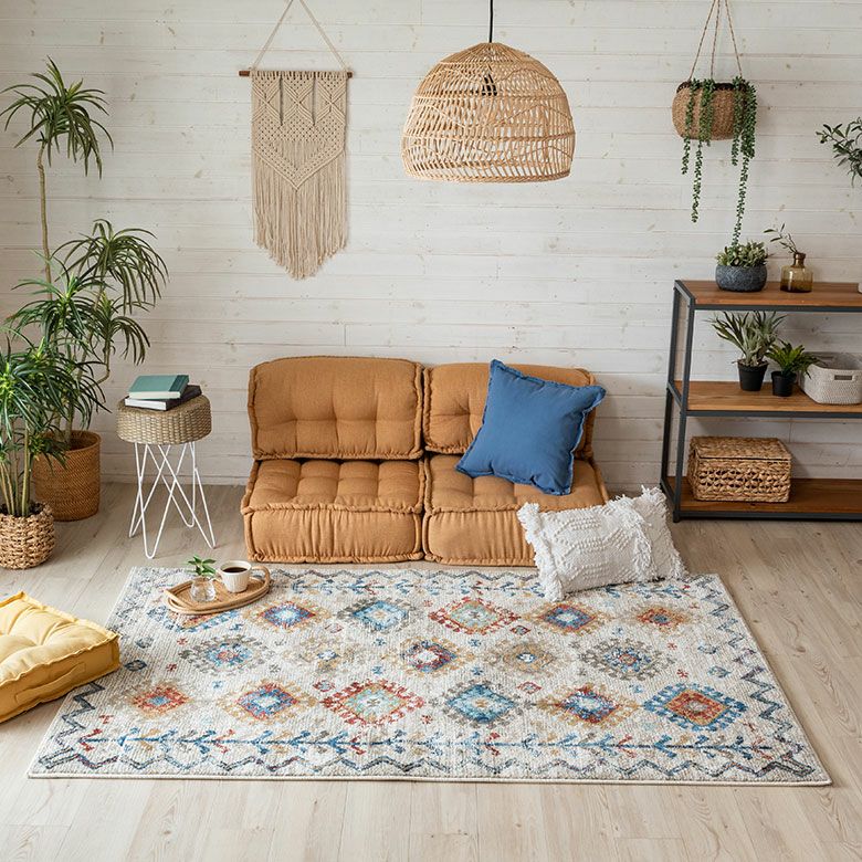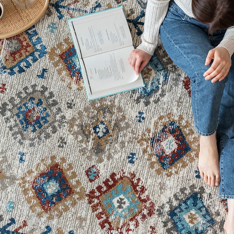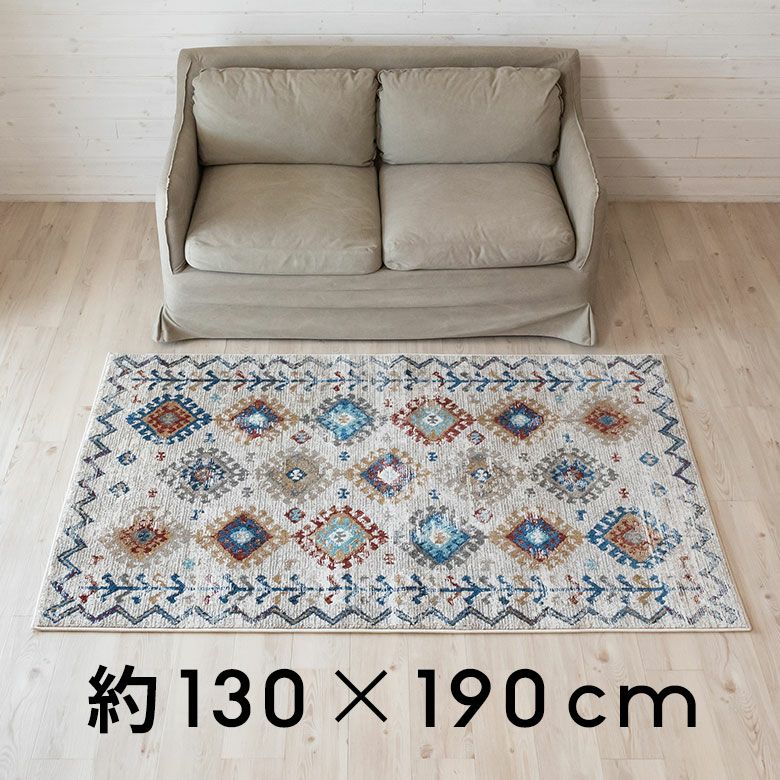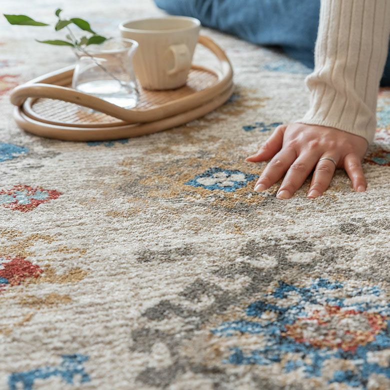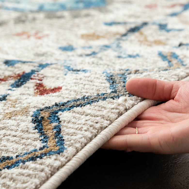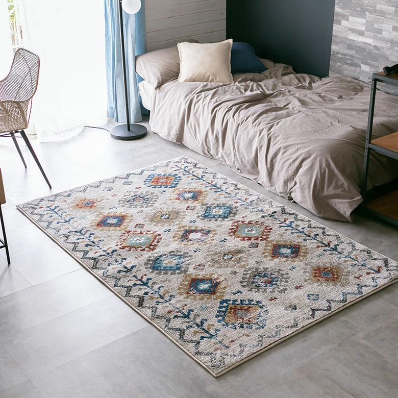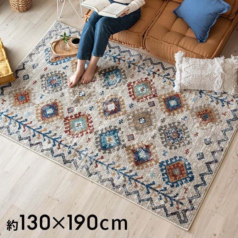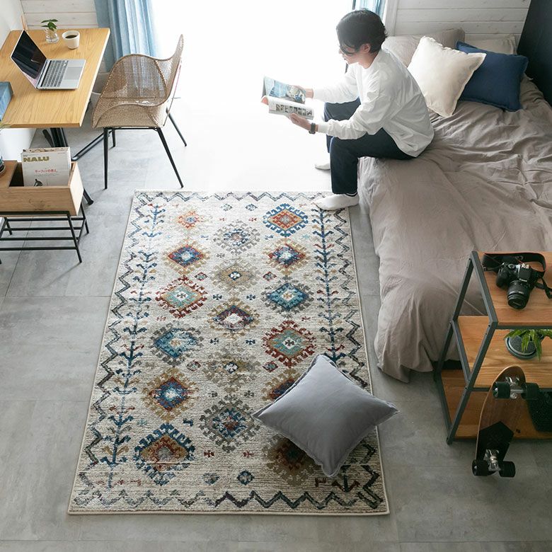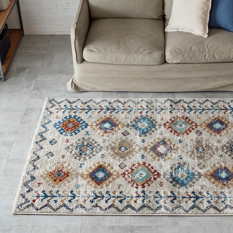 柔らかいアイボリーに、カラフルな幾何学模様が異国感漂う一枚。 まるでアートのようなデザインのラグは、 毛足が柔らかくとても密度が高いため、高級感があります。 高密度ウィルトン織りの魅力を活かし、 かすれたようなアンティーク感を表現しました。 モノトーンモダンからBOHOなど、幅広いコーディネートにおすすめ。 リビングでもダイニングでも、そしてオールシーズン活躍すること間違いなし!